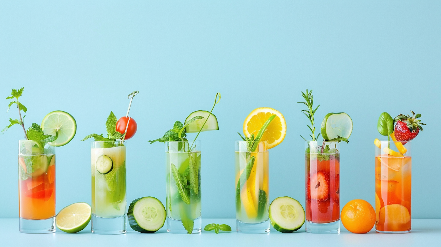 Colorful array of refreshing drinks with fresh fruit and herb garnishes against a soft blue background.