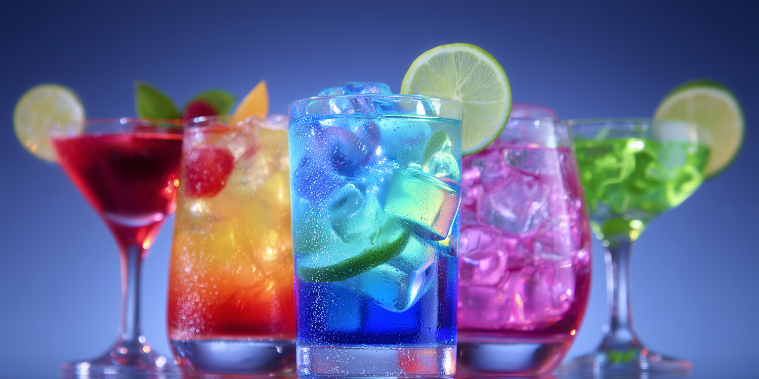 A vibrant display of colorful cocktails with garnishes and ice cubes, set against a gradient blue background.