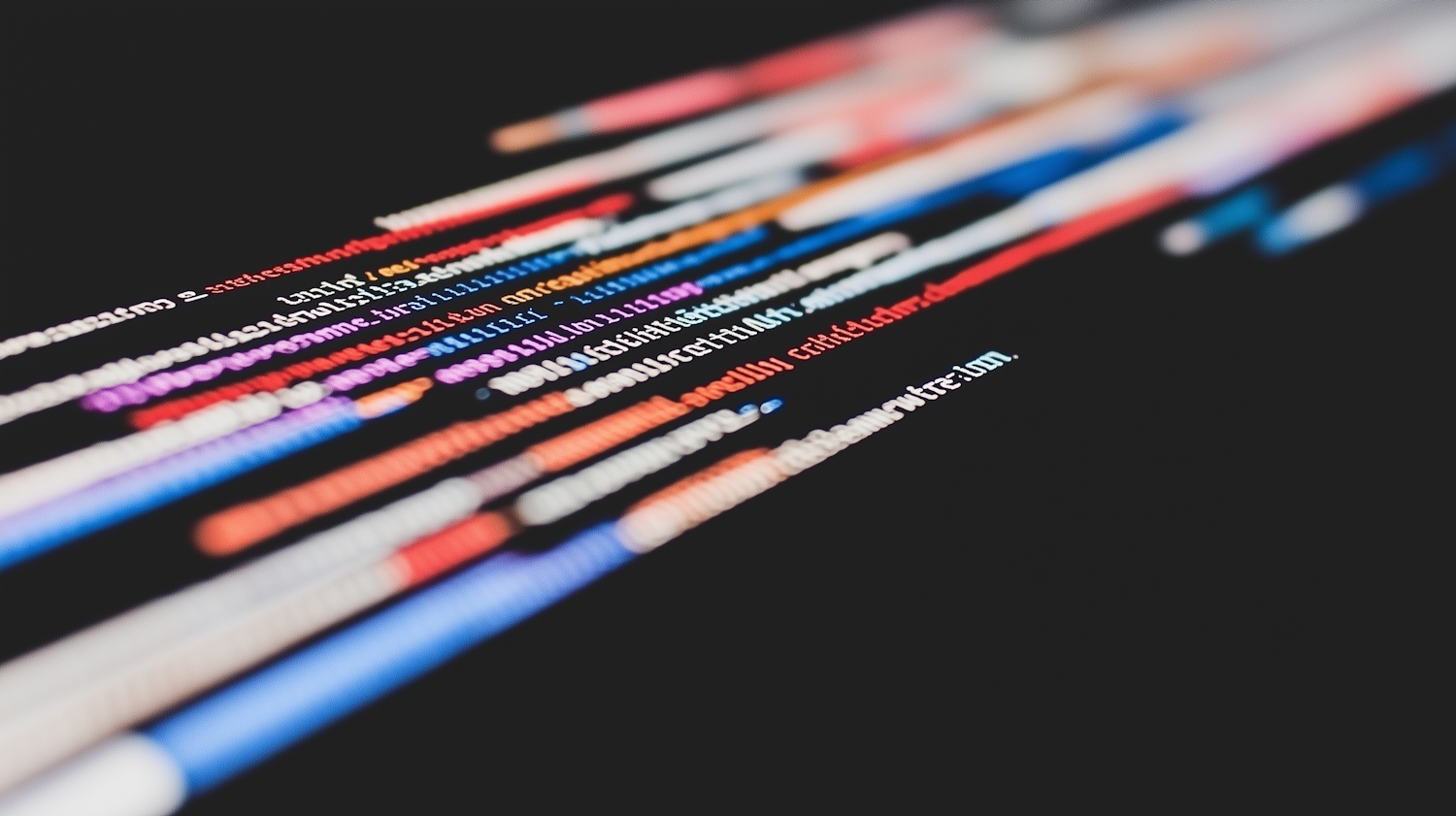 Close-up of colorful code lines on a black screen, showcasing syntax highlighting in vibrant colors for a tech-focused aesthetic.