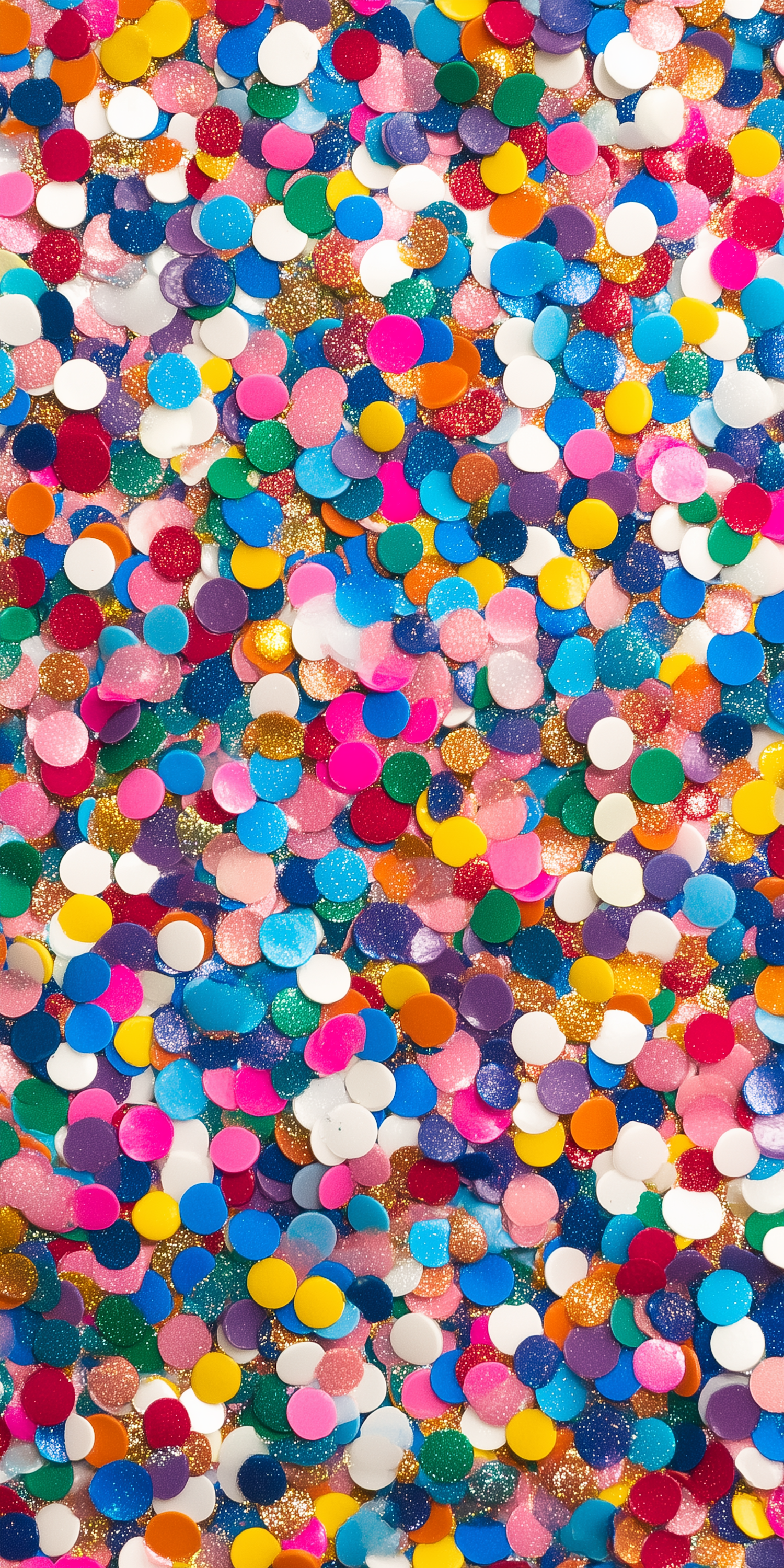 Bright and colorful confetti scattered randomly, featuring glittery and matte circular pieces in vibrant hues like pink, blue, and gold.