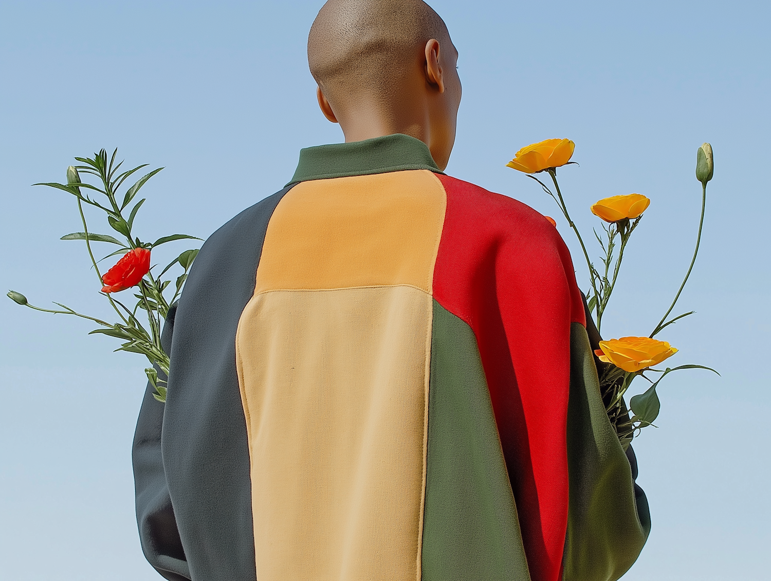 A person in a colorful jacket holds vibrant flowers against a clear blue sky, blending fashion and nature in a serene scene.