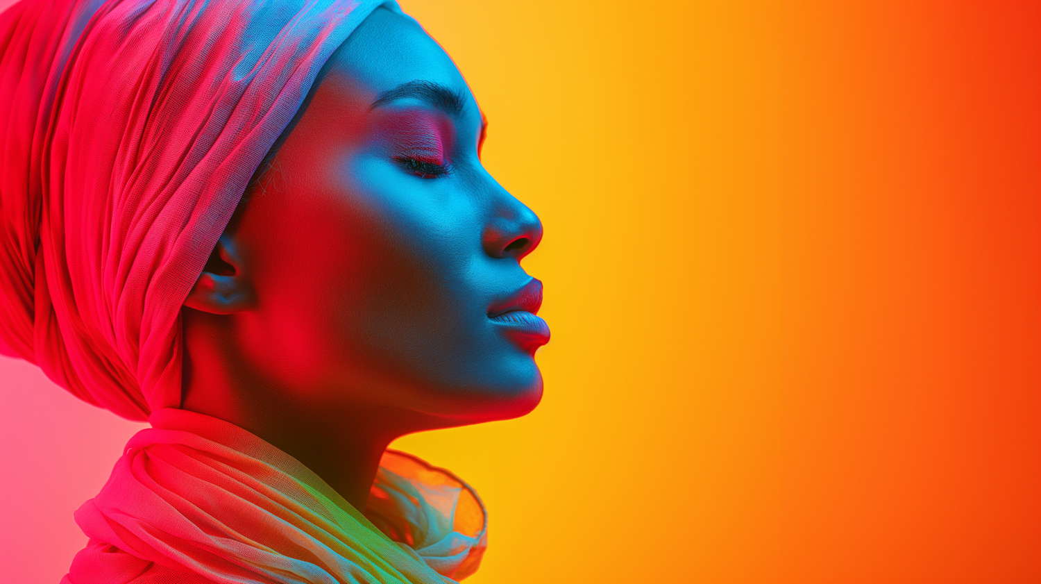 Vibrant portrait of a woman with a colorful headscarf, highlighted by dramatic blue and red lighting against an orange background.