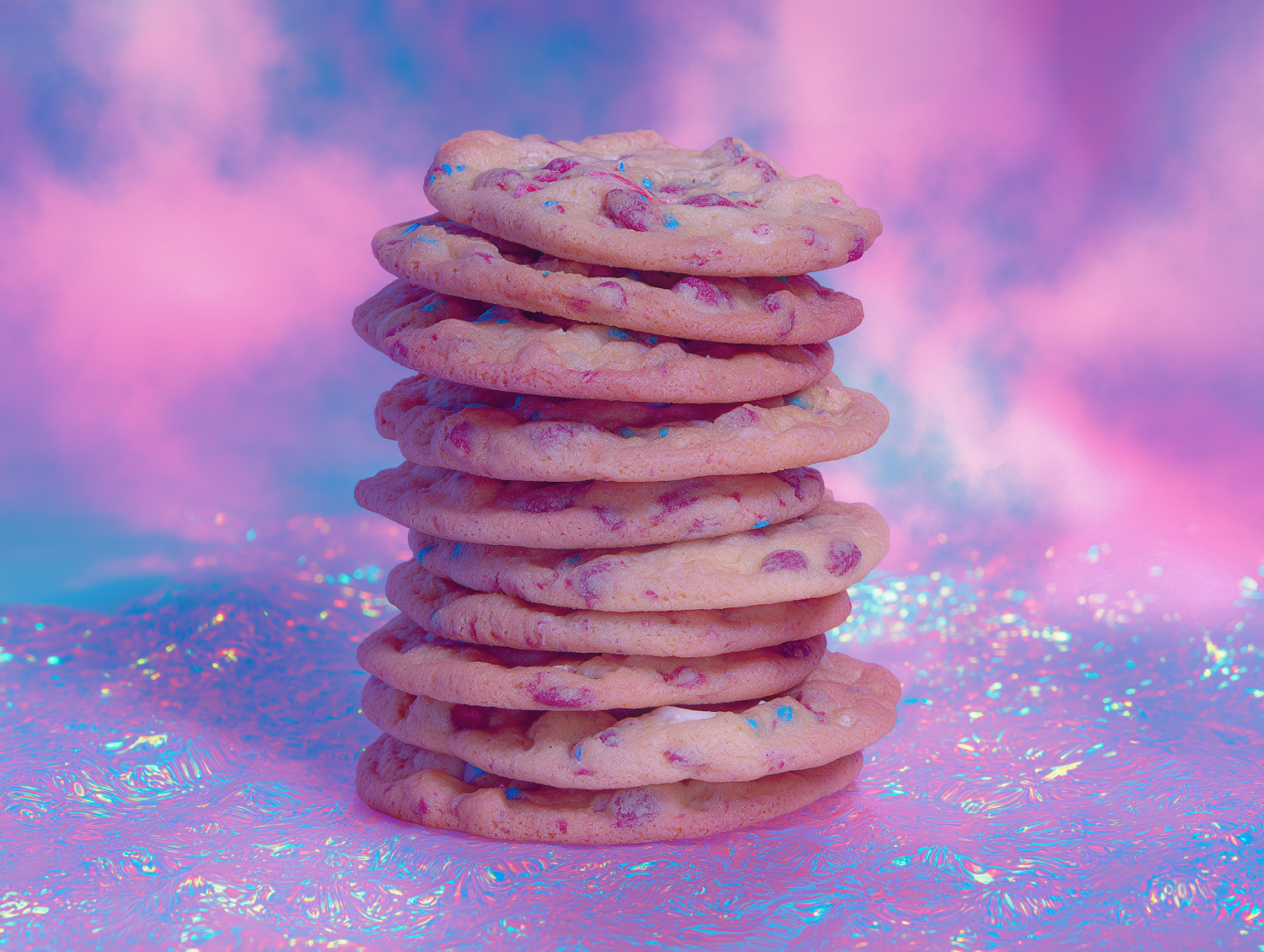 A stack of colorful chocolate chip cookies against a dreamy pink and blue textured background.