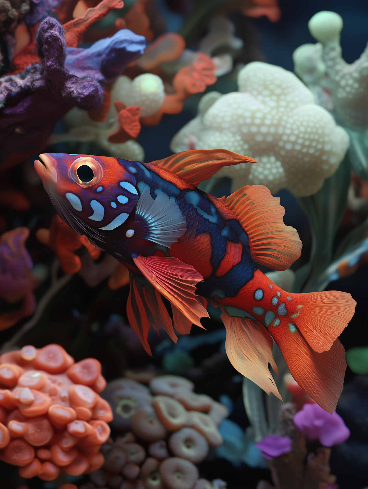 A vividly colored fish with red, orange, and blue patterns swims among vibrant coral reefs in this stunning underwater scene.