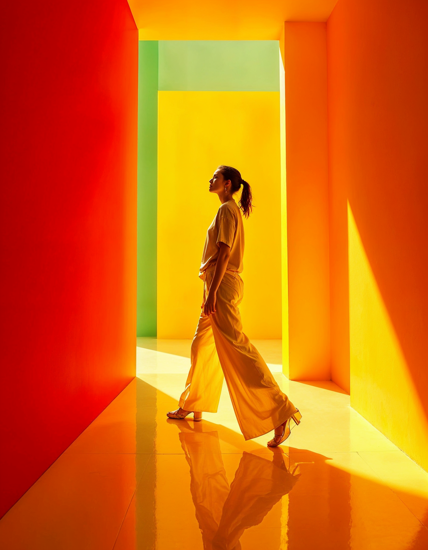 A woman in a yellow outfit walks through a vibrant corridor with bold red, orange, and yellow walls, bathed in sunlight.