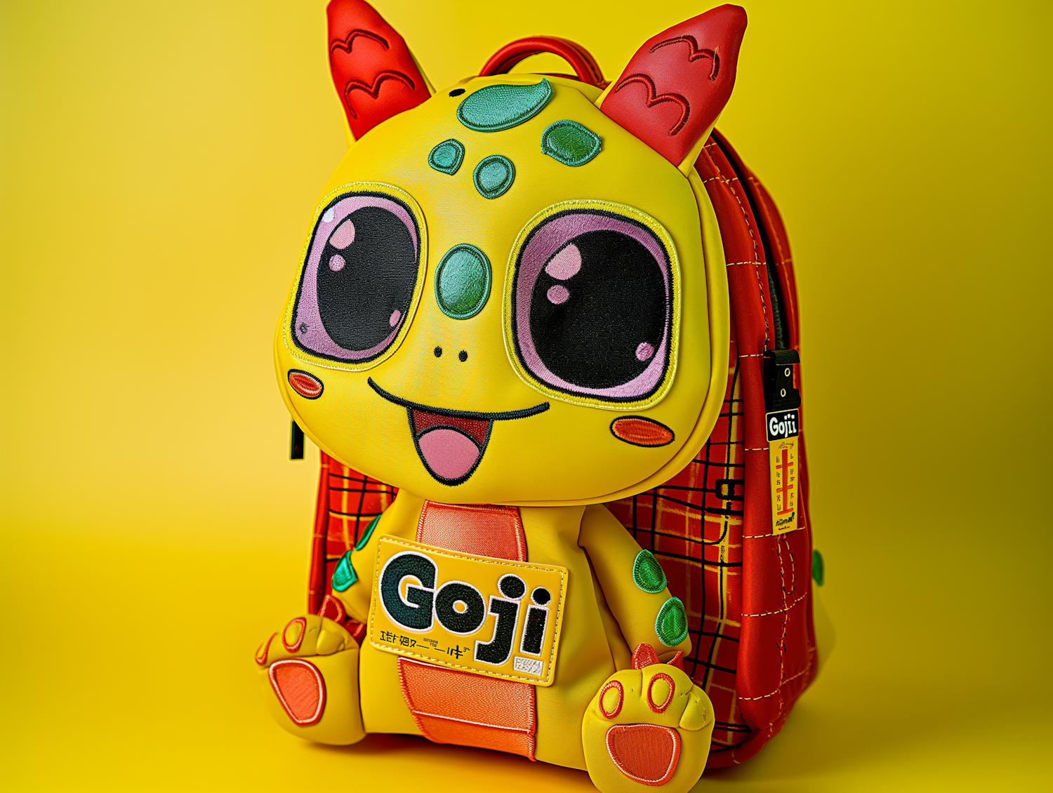 Colorful cartoon character backpack with big eyes and a cheerful smile, featuring 'Goji' branding. Perfect for kids and playful adults.