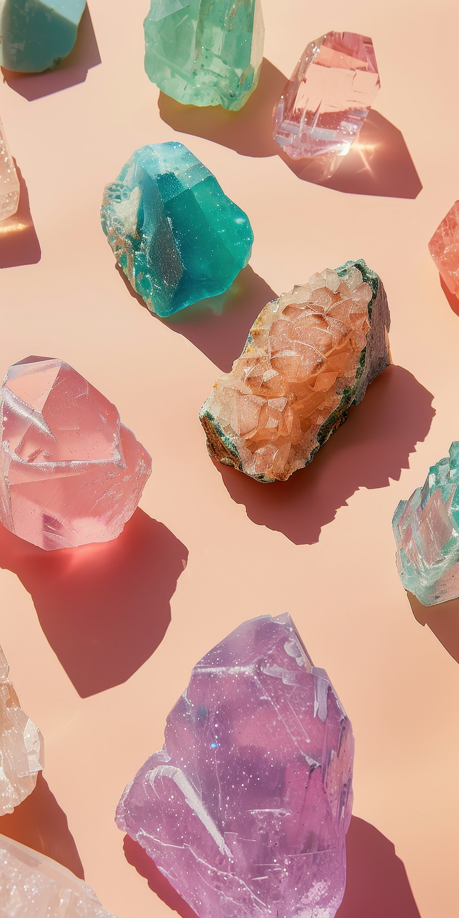 Vibrant crystals in pink, green, blue, and purple on a peach background, casting sparkling shadows in sunlight.