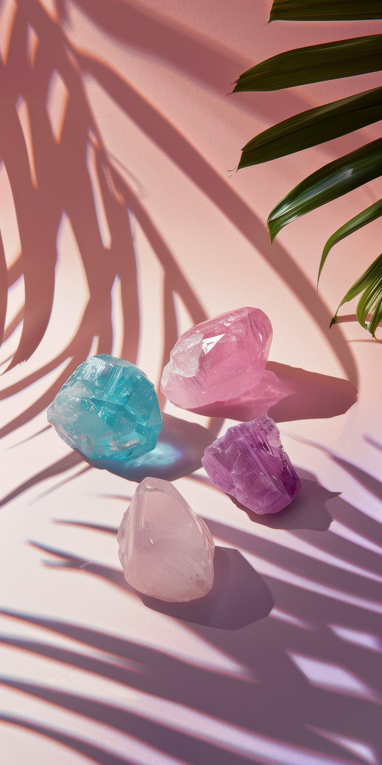 Vibrant crystals on a pink surface with dynamic leaf shadows, creating a serene and colorful composition.