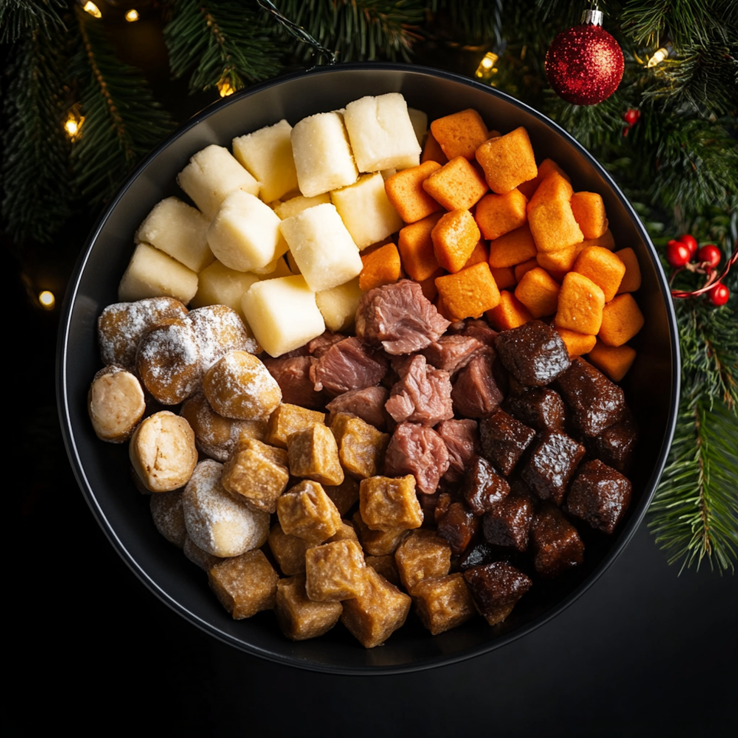A festive bowl of assorted treats with Christmas decorations, featuring colorful cubes and holiday ornaments.