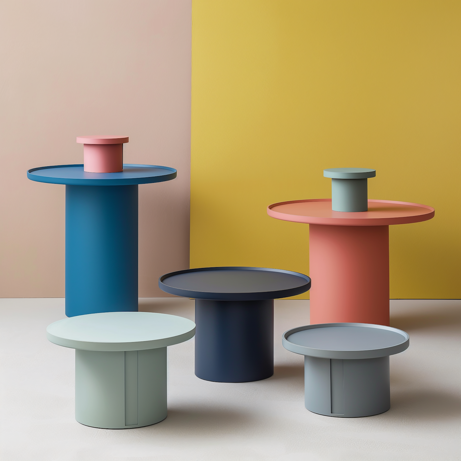 Modern pastel tables in teal, coral, navy, mint, and gray against a beige and mustard background. Minimalist and geometric design.