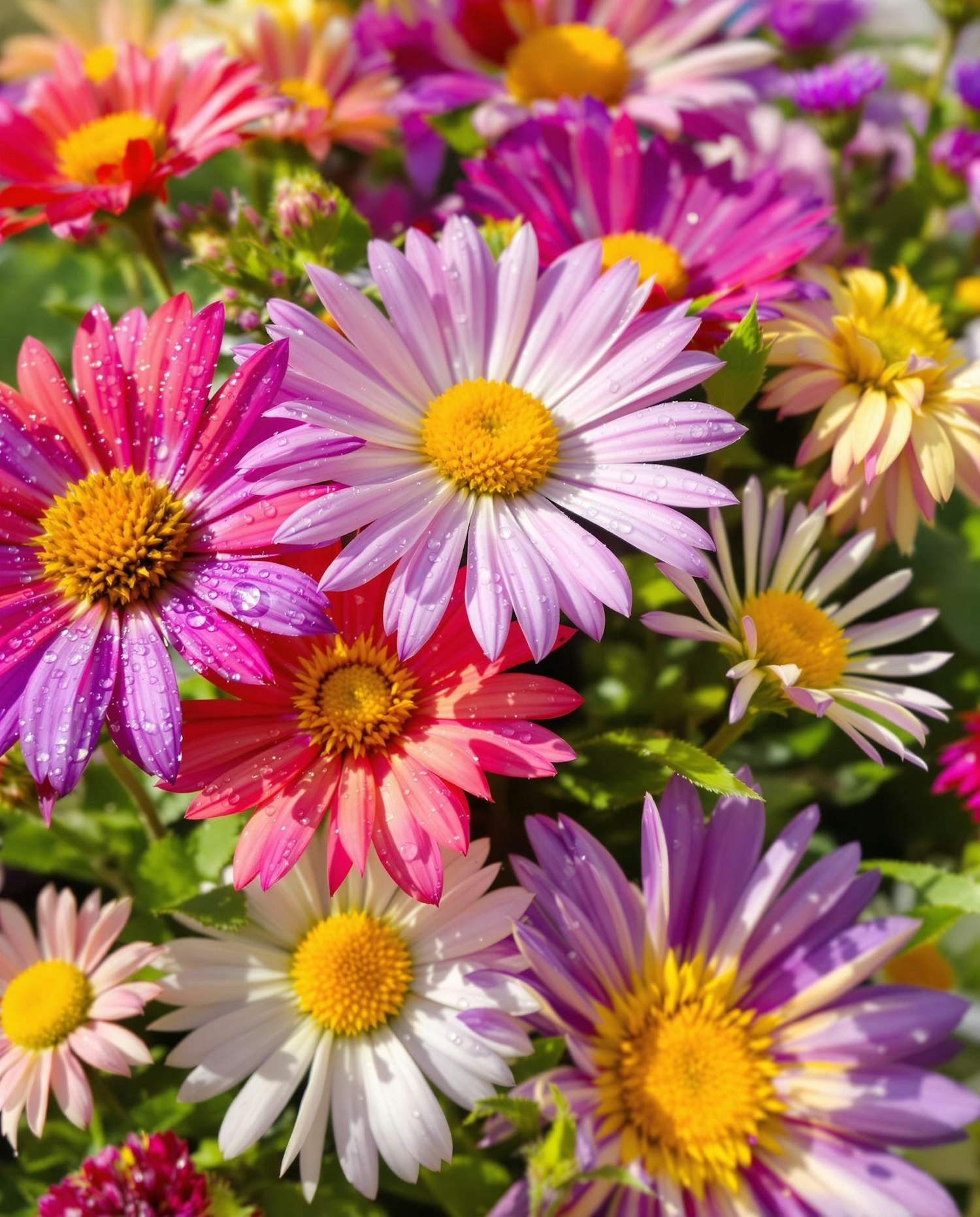 Bright and colorful daisies with water droplets, featuring pink, purple, and white petals with yellow centers, perfect for a cheerful vibe.