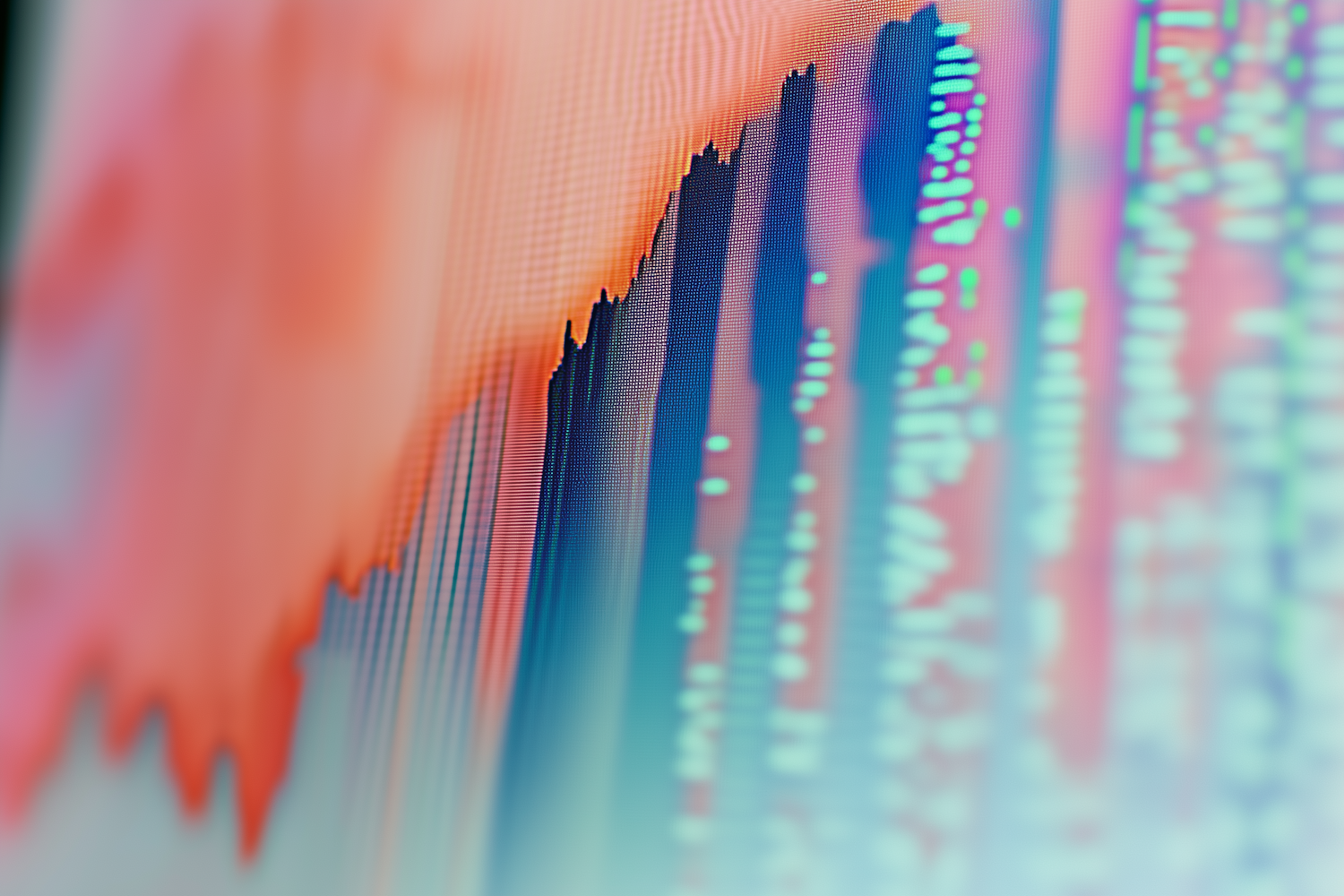 Close-up of a colorful digital graph with sharp peaks and blurred data in the background, symbolizing analytics or market trends.