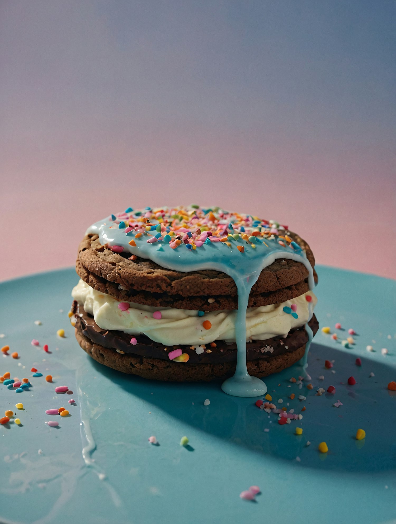 Delicious chocolate cookie sandwich with cream, blue icing, and colorful sprinkles on a pastel blue plate. Perfect for dessert lovers!