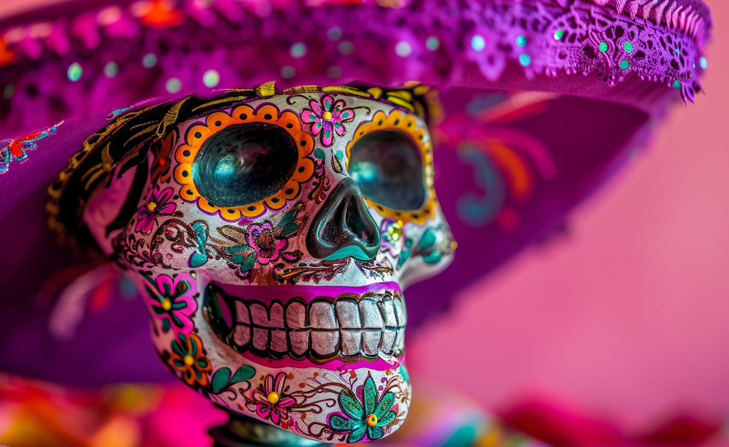Colorful sugar skull with floral patterns and a purple sombrero, symbolizing Day of the Dead celebrations.