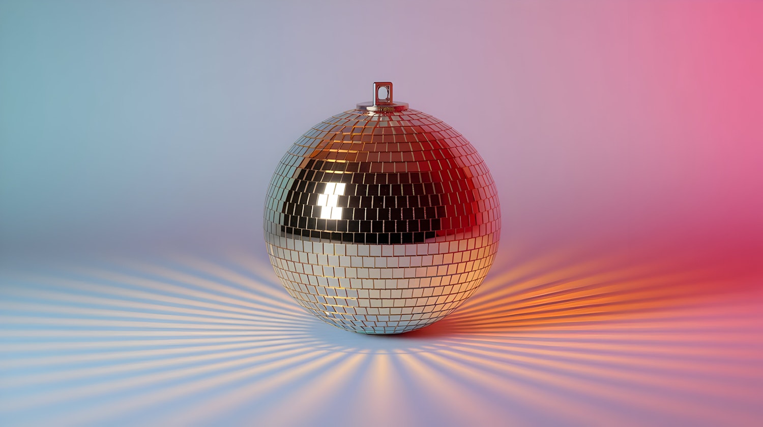 A reflective disco ball radiates colorful light patterns on a gradient background with hues of blue, red, and orange.