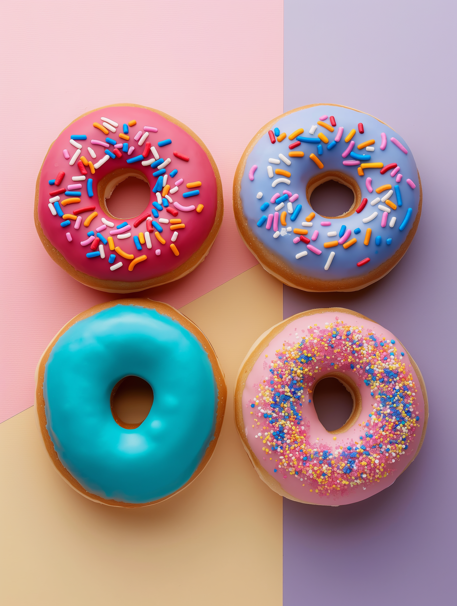 Four vibrant donuts with colorful icing and sprinkles on a pastel background, creating a playful and appetizing scene.