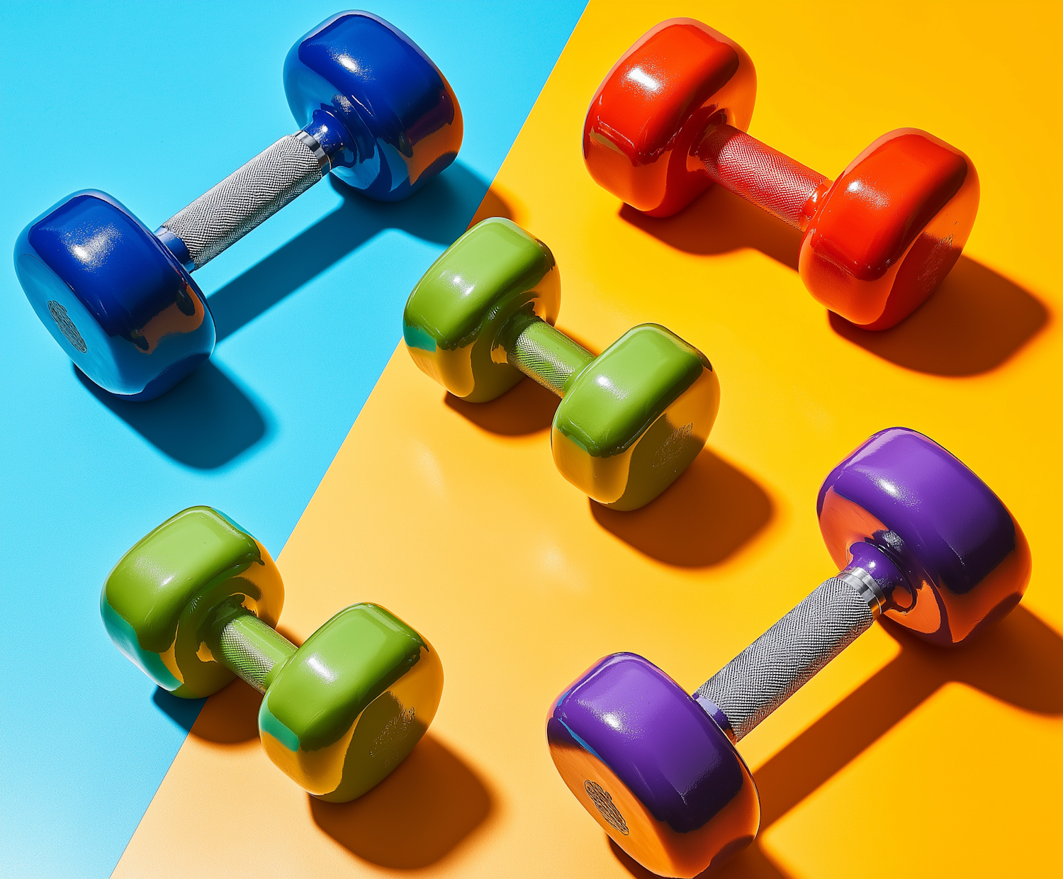 Vibrant dumbbells on a split blue and orange background, showcasing fitness and energy with bold colors and metallic grips.