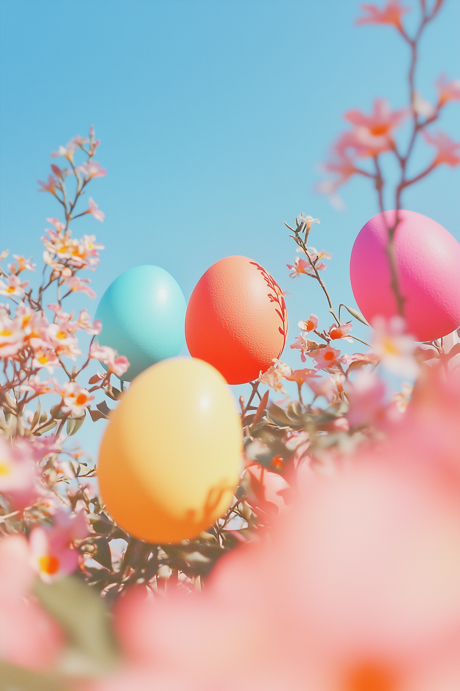 Colorful Easter eggs nestled among pink flowers against a clear blue sky, creating a vibrant and festive spring scene.