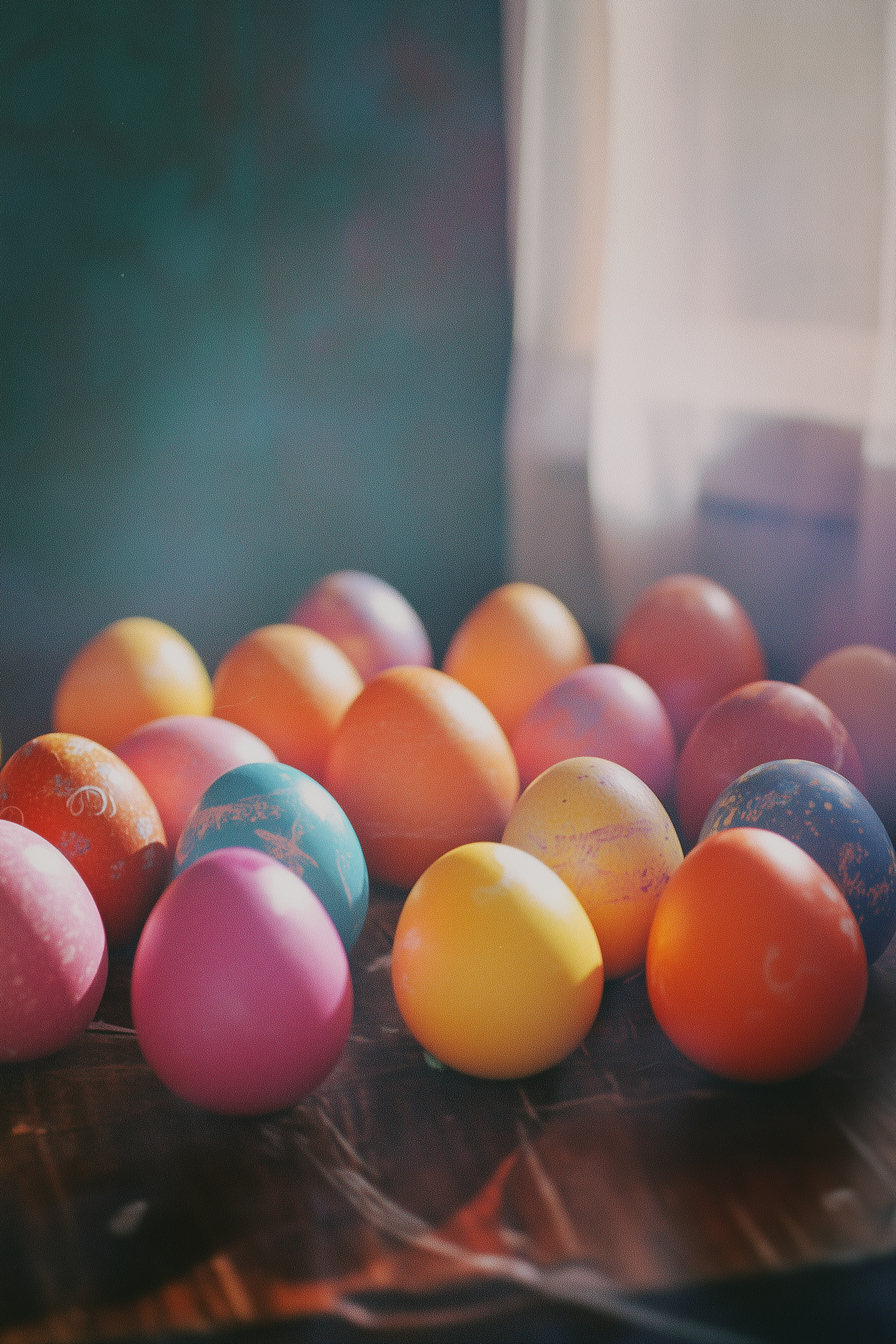 Vibrant Easter eggs in pink, orange, yellow, and blue with patterns, bathed in soft natural light, creating a festive atmosphere.