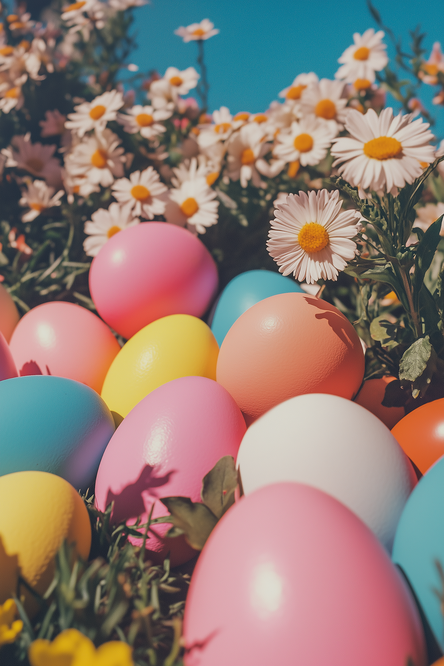 Colorful Easter eggs nestled in grass with blooming daisies under a clear blue sky, creating a vibrant spring scene.