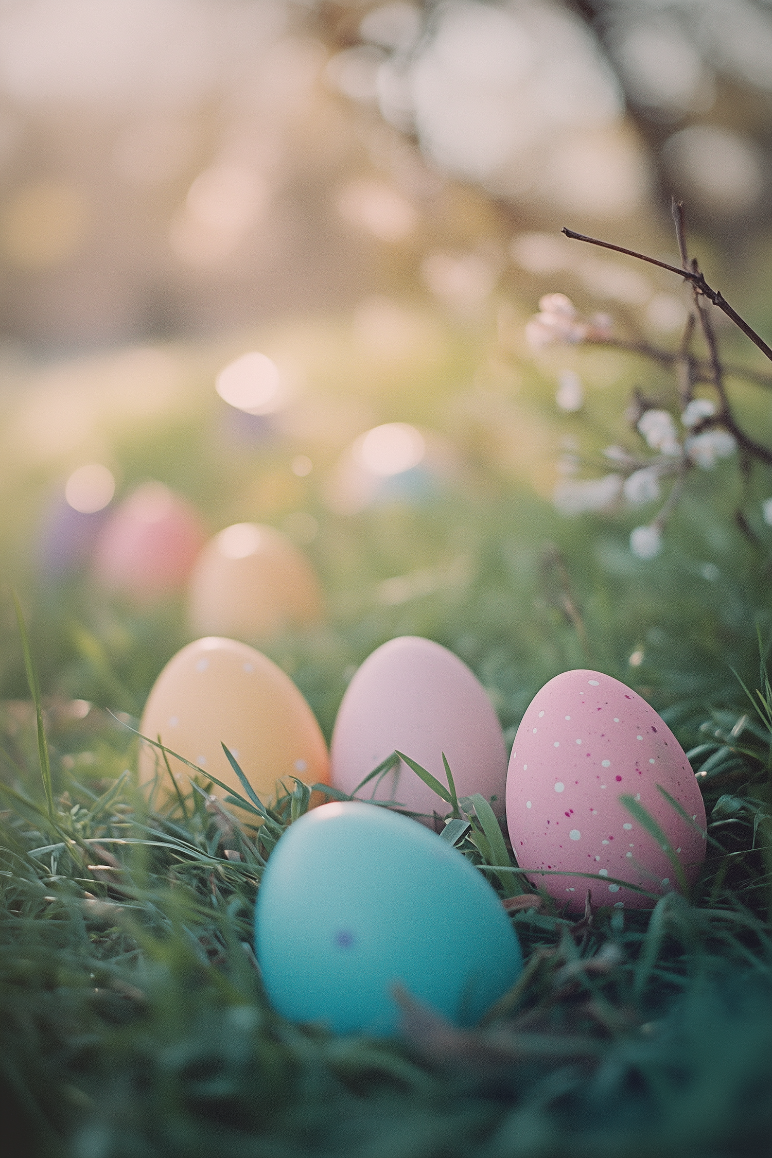Pastel Easter eggs on green grass with white blossoms and warm sunlight, creating a dreamy springtime atmosphere.