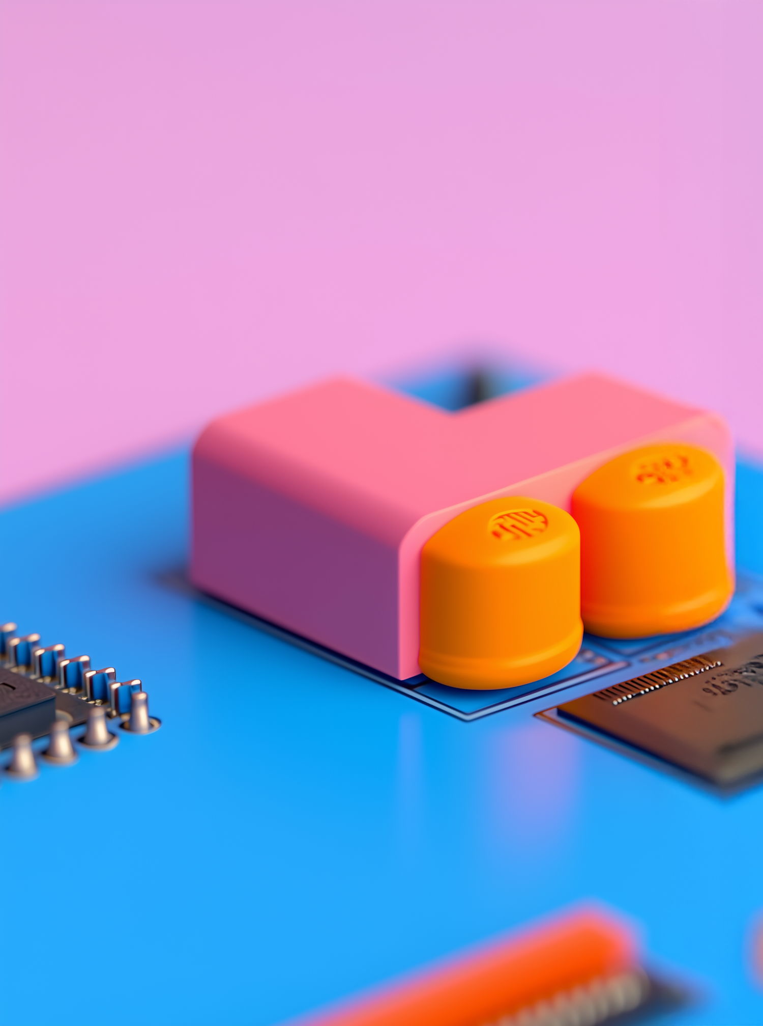 Close-up of a colorful circuit board with pink, orange, and blue components, blending technology with a playful design.