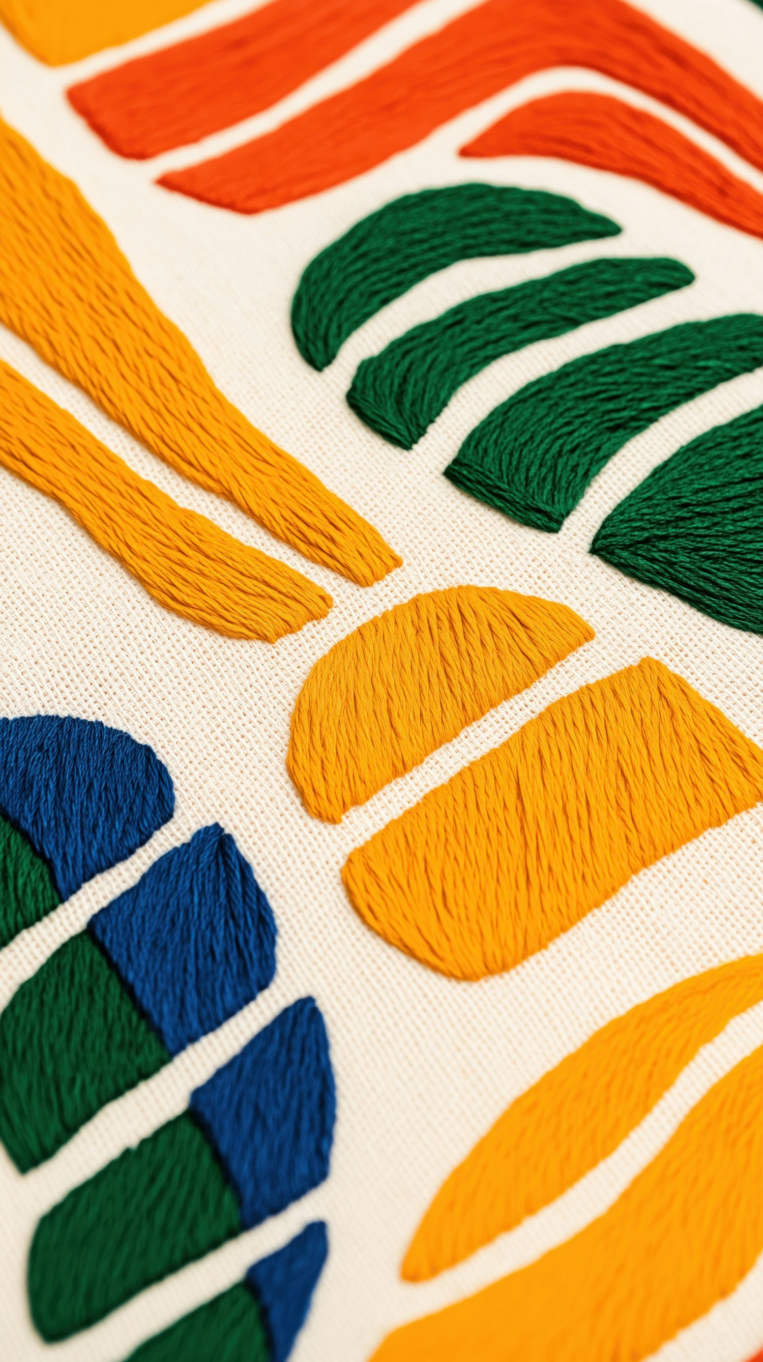 Close-up of colorful embroidery with abstract shapes in orange, green, blue, and yellow on a neutral fabric background.