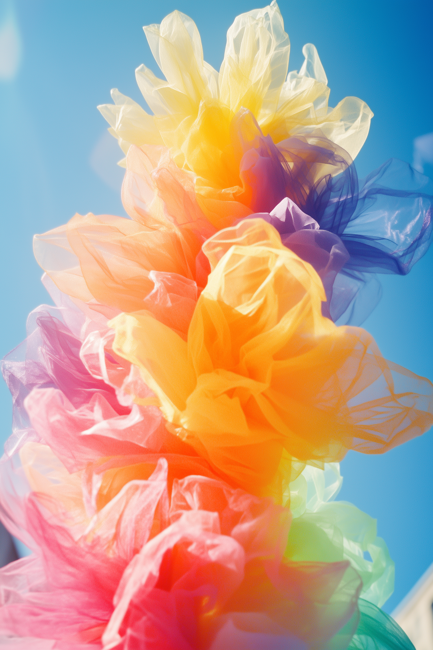 Vibrant translucent fabric or paper arranged like flowers against a clear blue sky, showcasing a spectrum of colors and ethereal glow.