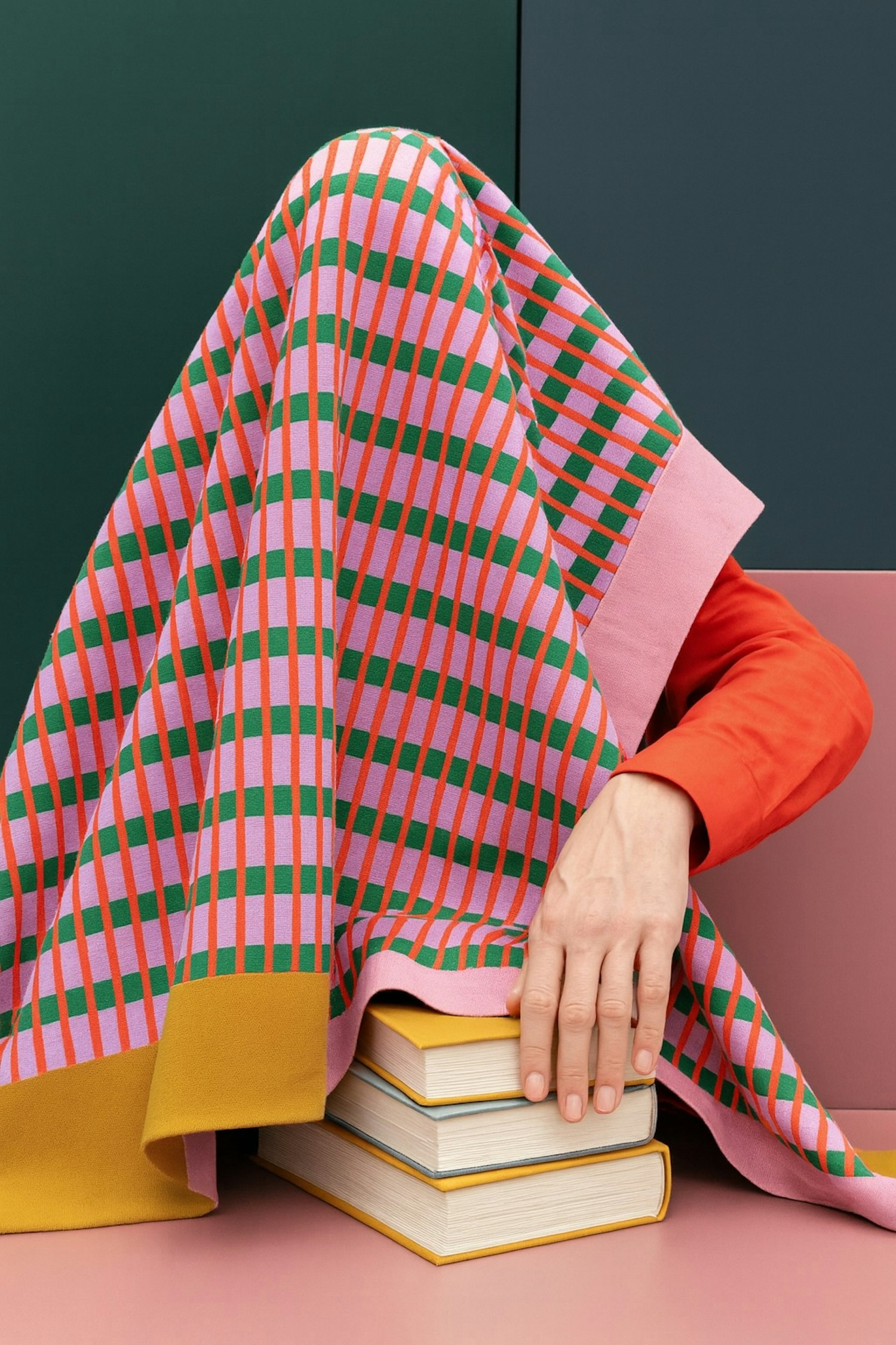 A vibrant scene with a person draped in colorful fabric, resting on books, set against a modern, color-blocked background.