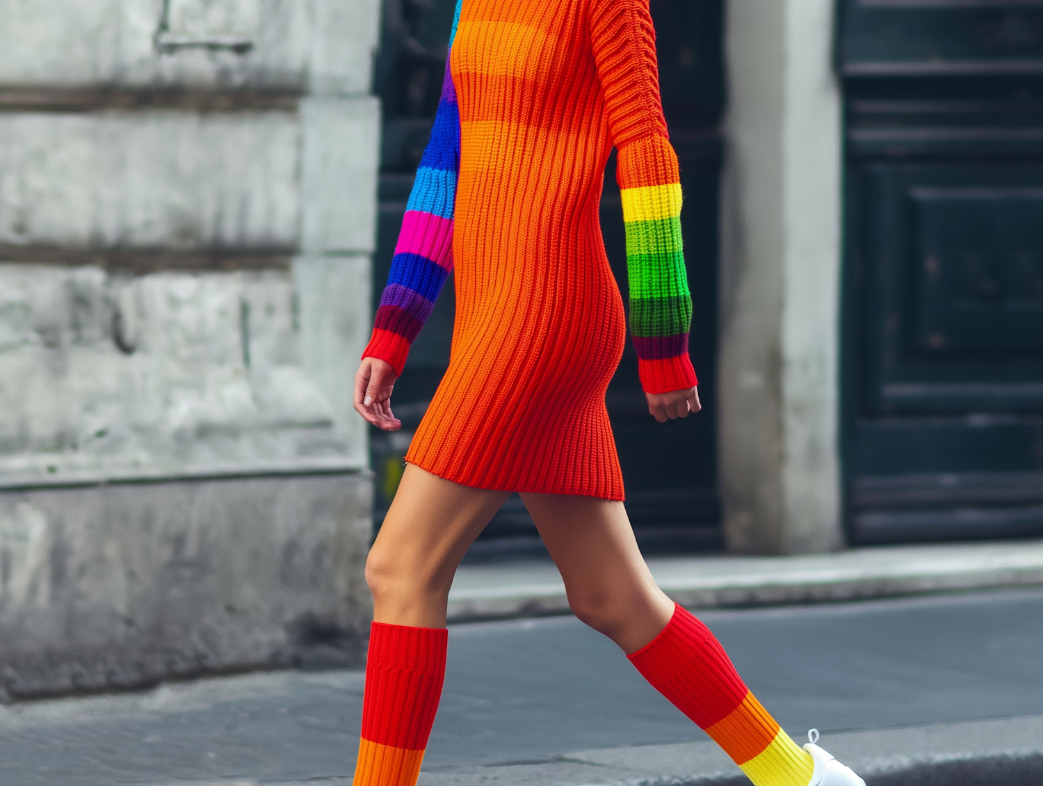 Vibrant street style with a multicolored knit dress and matching socks, perfect for a bold fashion statement.