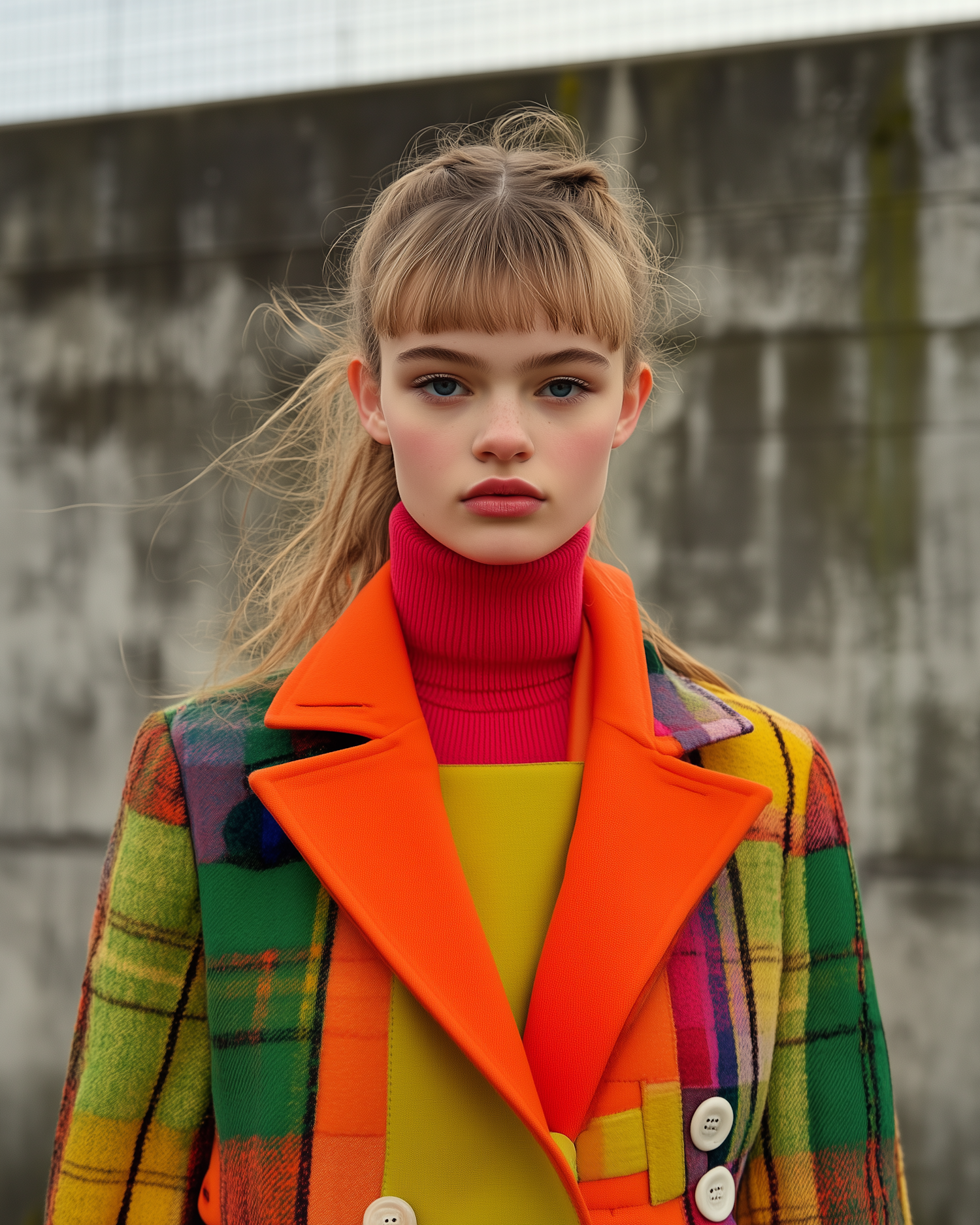 A young woman in a vibrant plaid coat with orange lapels, red turtleneck, and yellow top stands against a muted concrete wall.
