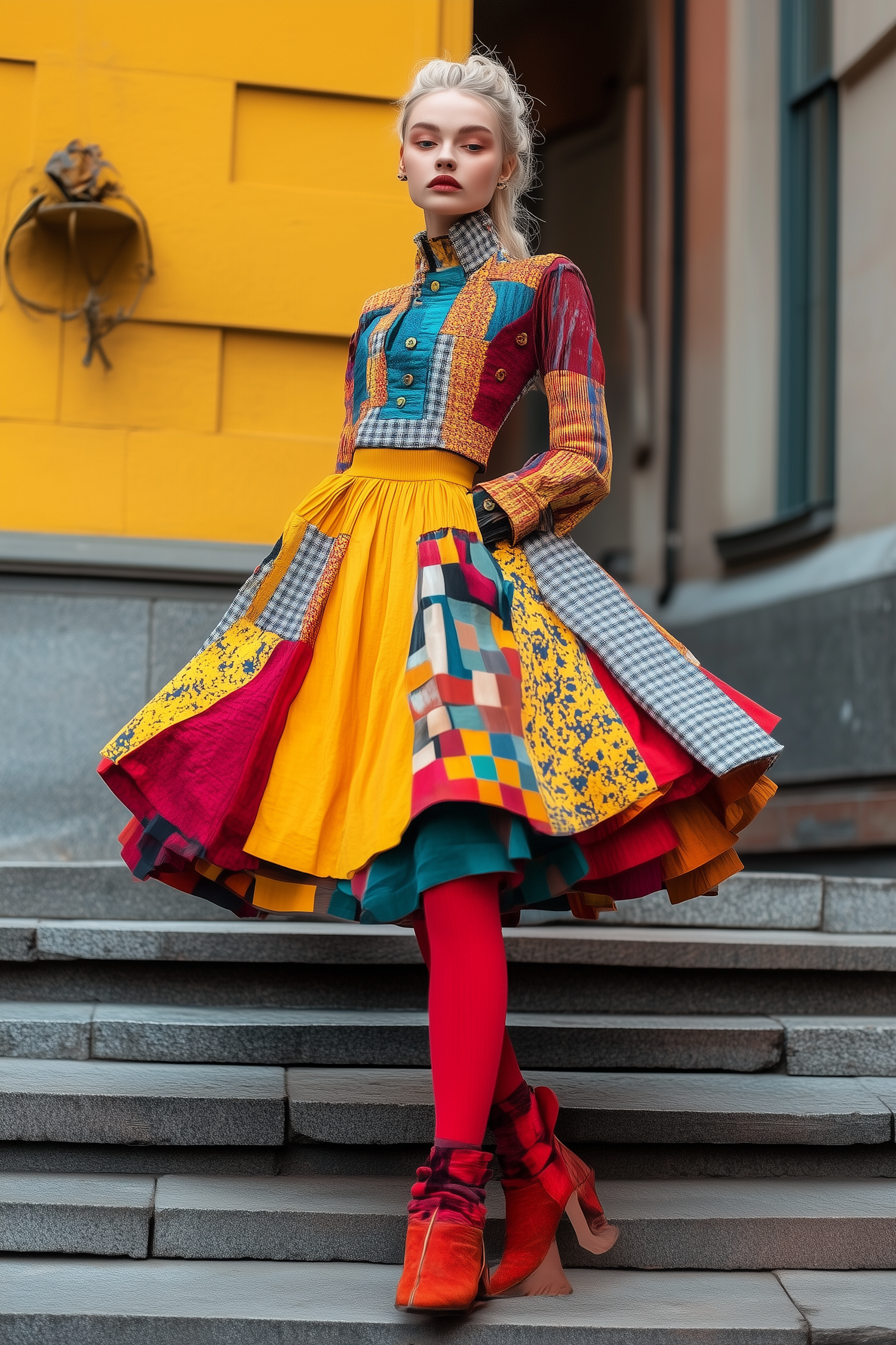 A stylish woman in a colorful patchwork dress, red tights, and orange heels poses on stone steps against a mustard-yellow wall.