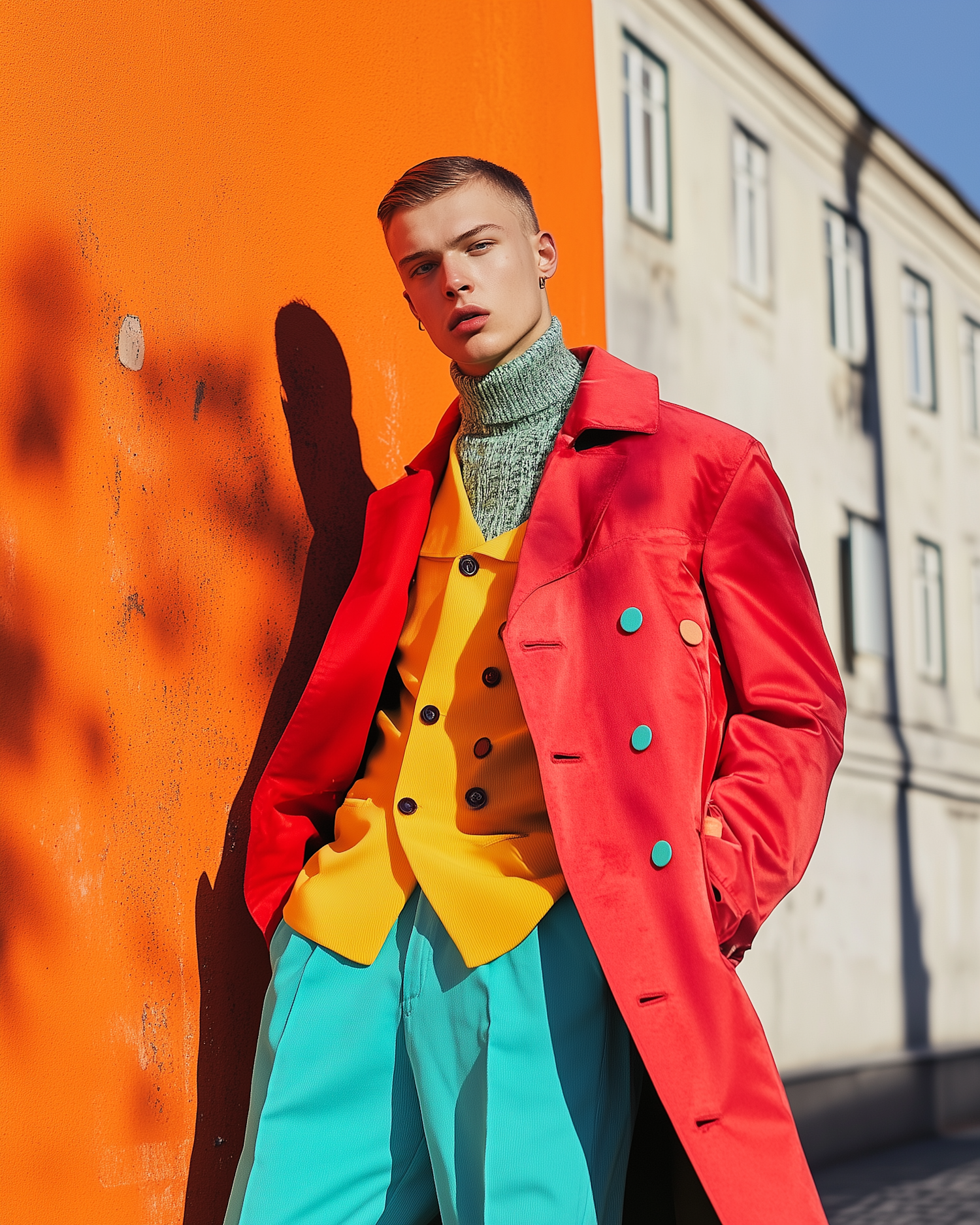 Stylish young man in a vibrant red coat and teal pants against an orange wall, showcasing bold fashion choices.
