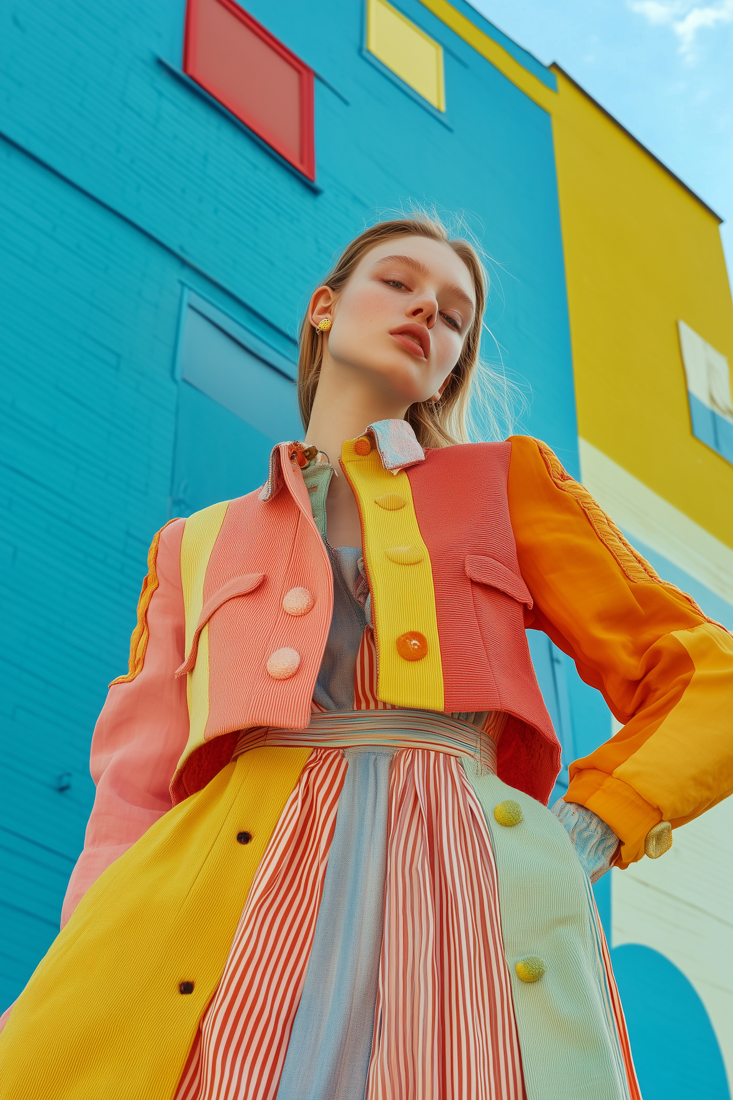 A stylish woman in a colorful outfit poses against a vibrant blue and yellow building with geometric windows. Bold and artistic vibes.