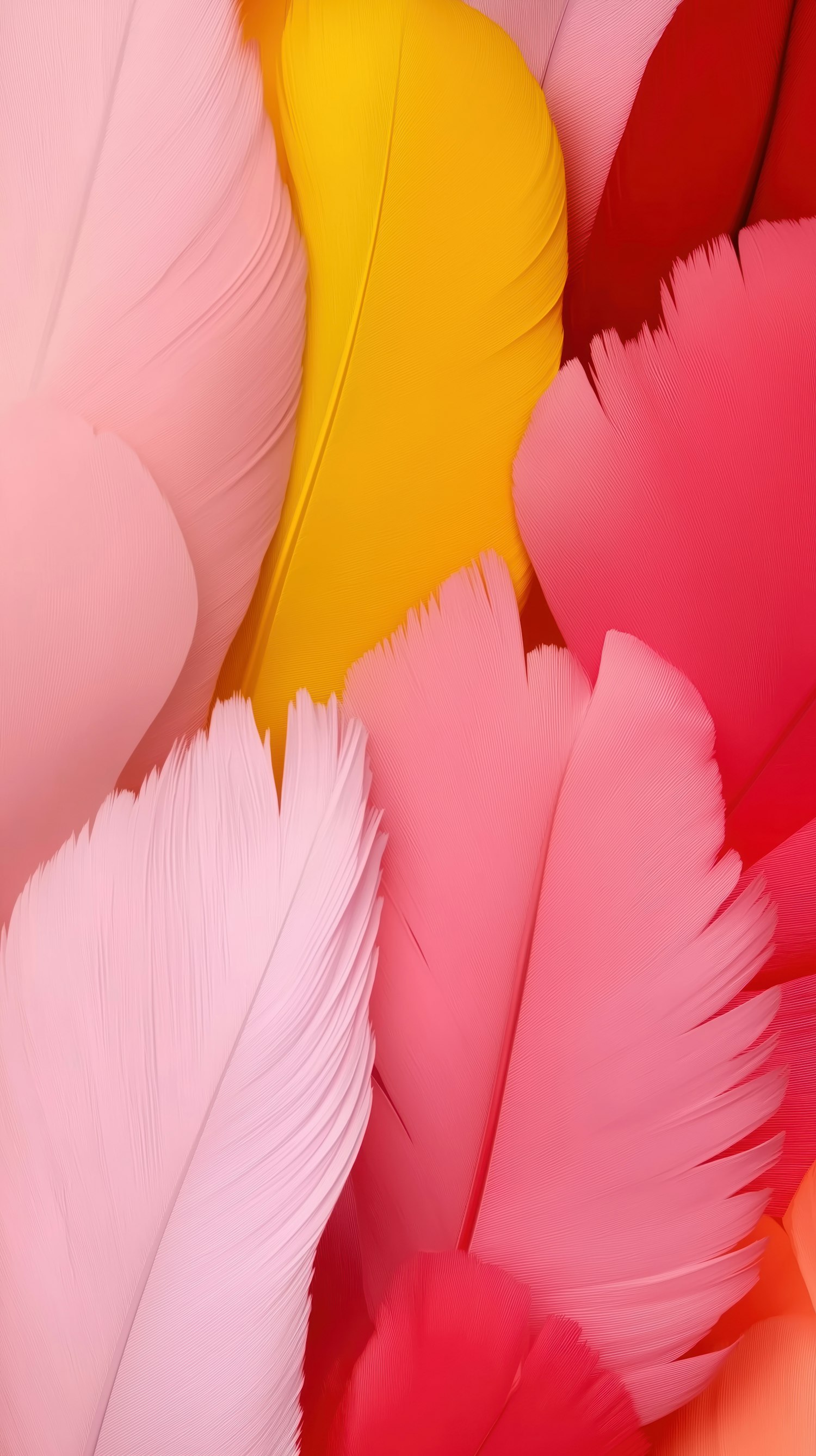 Bright close-up of pink, yellow, and red feathers with intricate textures and soft edges, creating a vibrant and delicate composition.