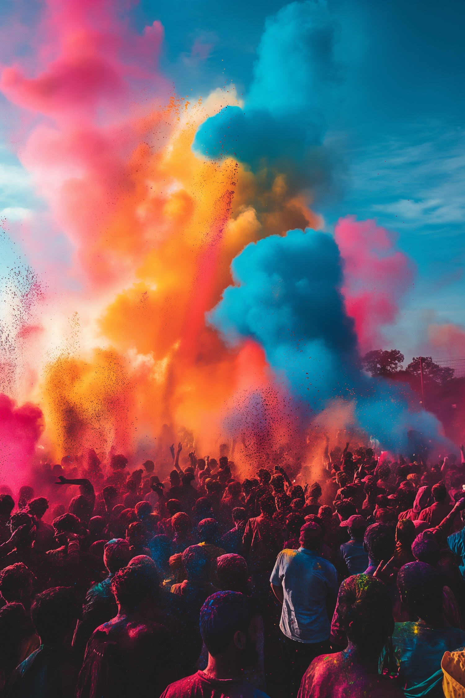 A lively festival scene with a crowd throwing vibrant powders in the air, creating a colorful explosion against a clear blue sky.