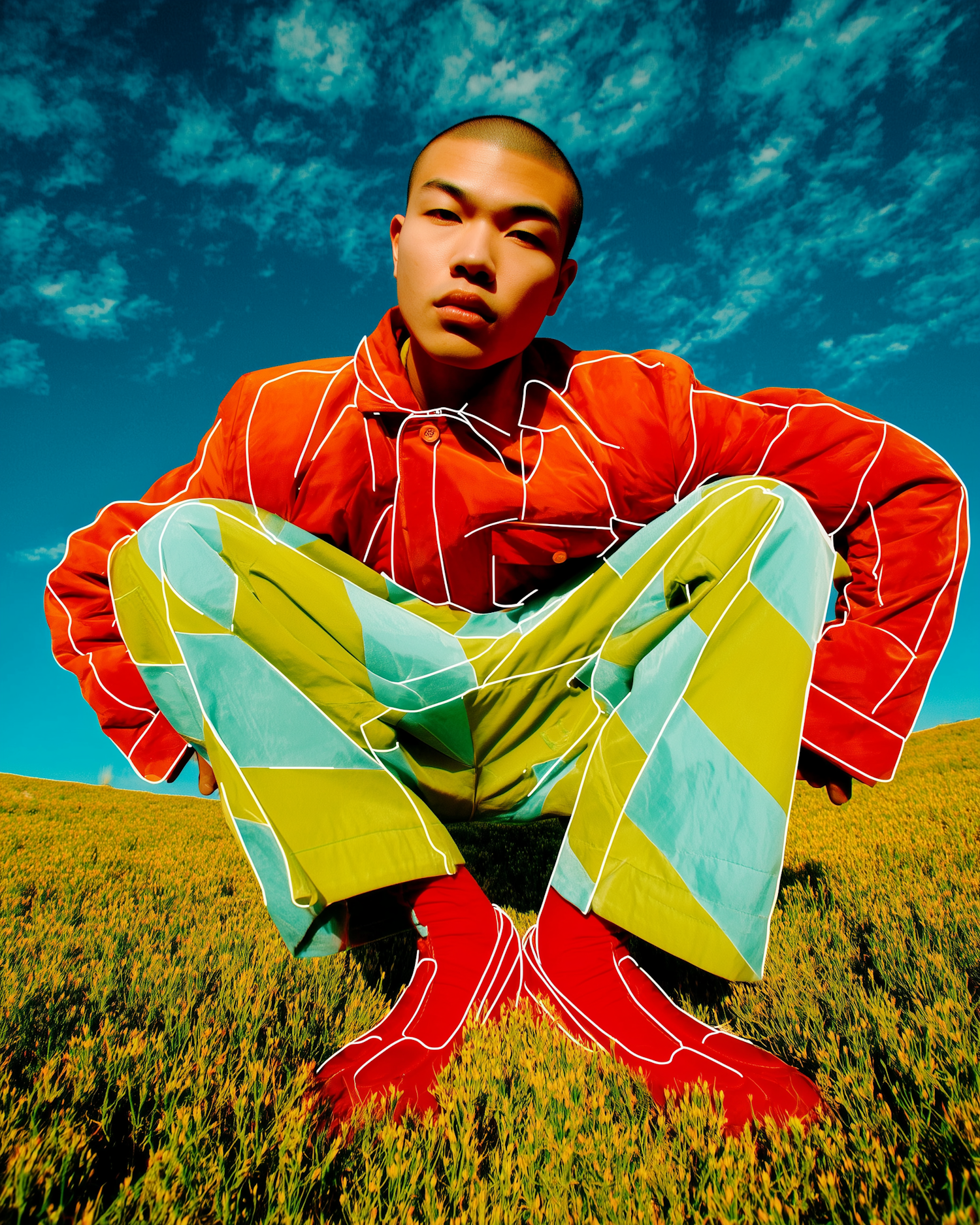 A person in a vibrant red and green outfit crouches in a grassy field under a vivid blue sky, creating a dynamic and colorful scene.