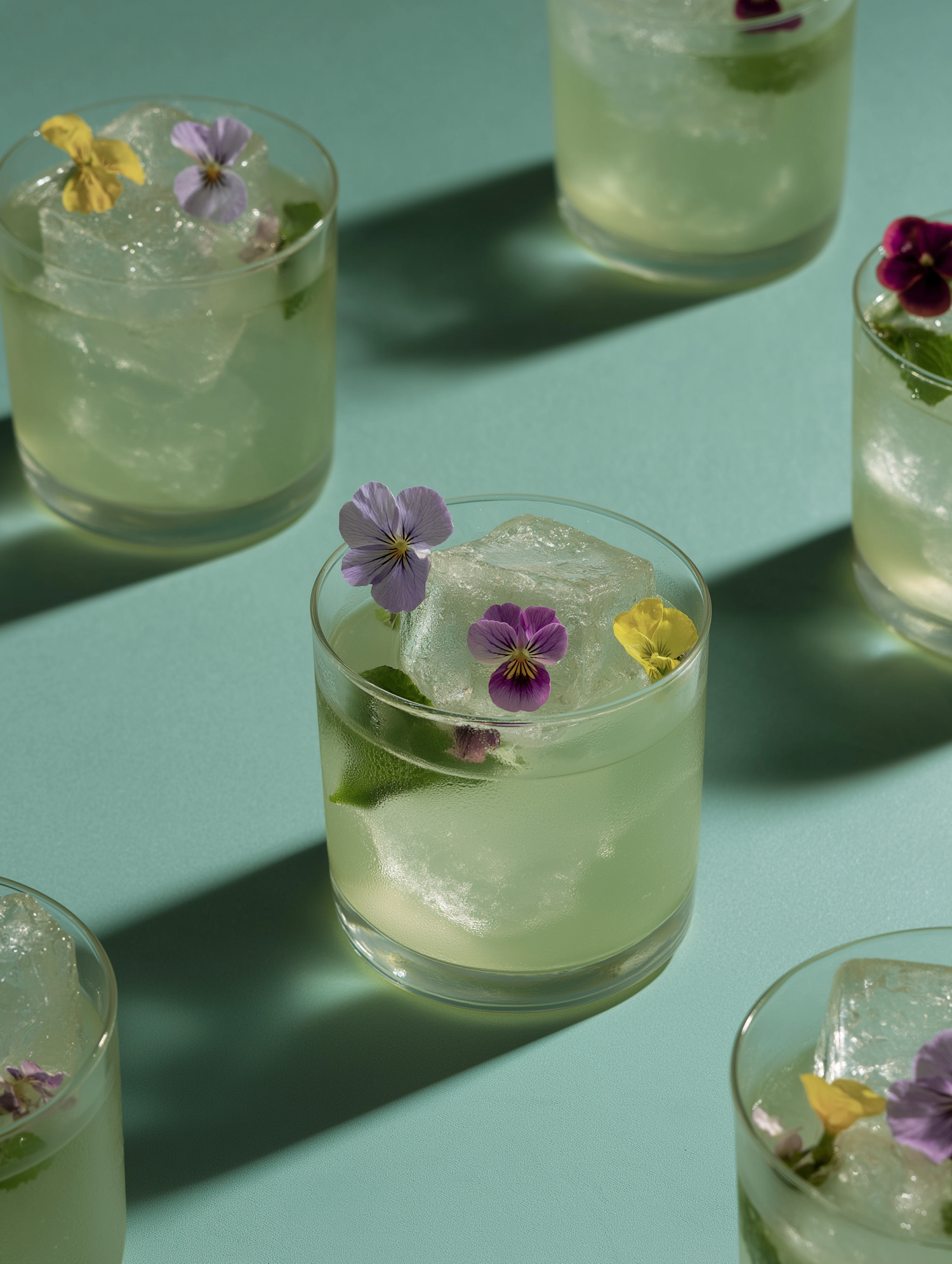Vivid green cocktails in clear glasses are topped with edible flowers, creating an elegant and refreshing scene against a teal backdrop.