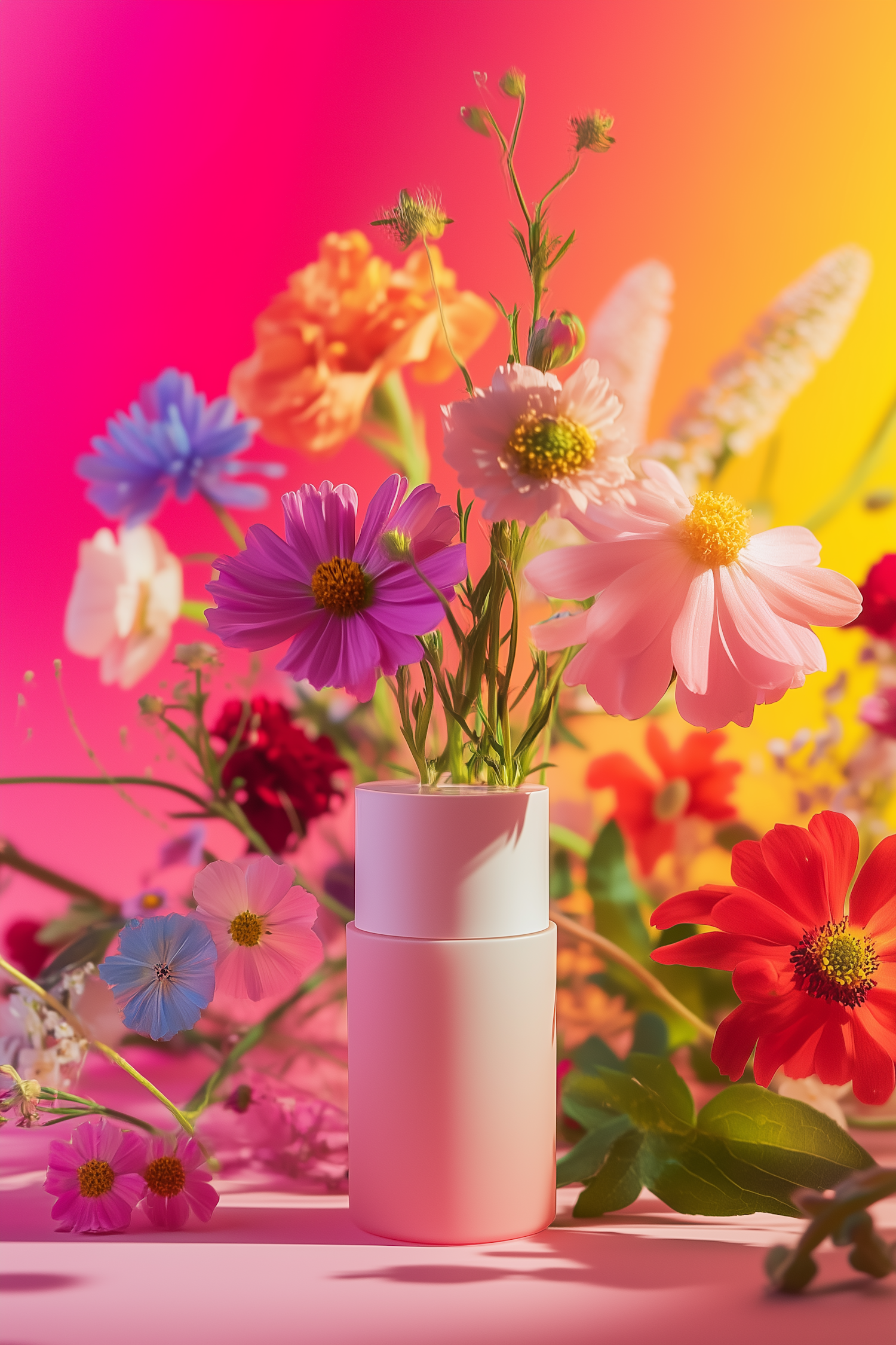 Bright flowers in a sleek white vase pop against a pink-to-yellow gradient background, creating a cheerful and vibrant aesthetic.