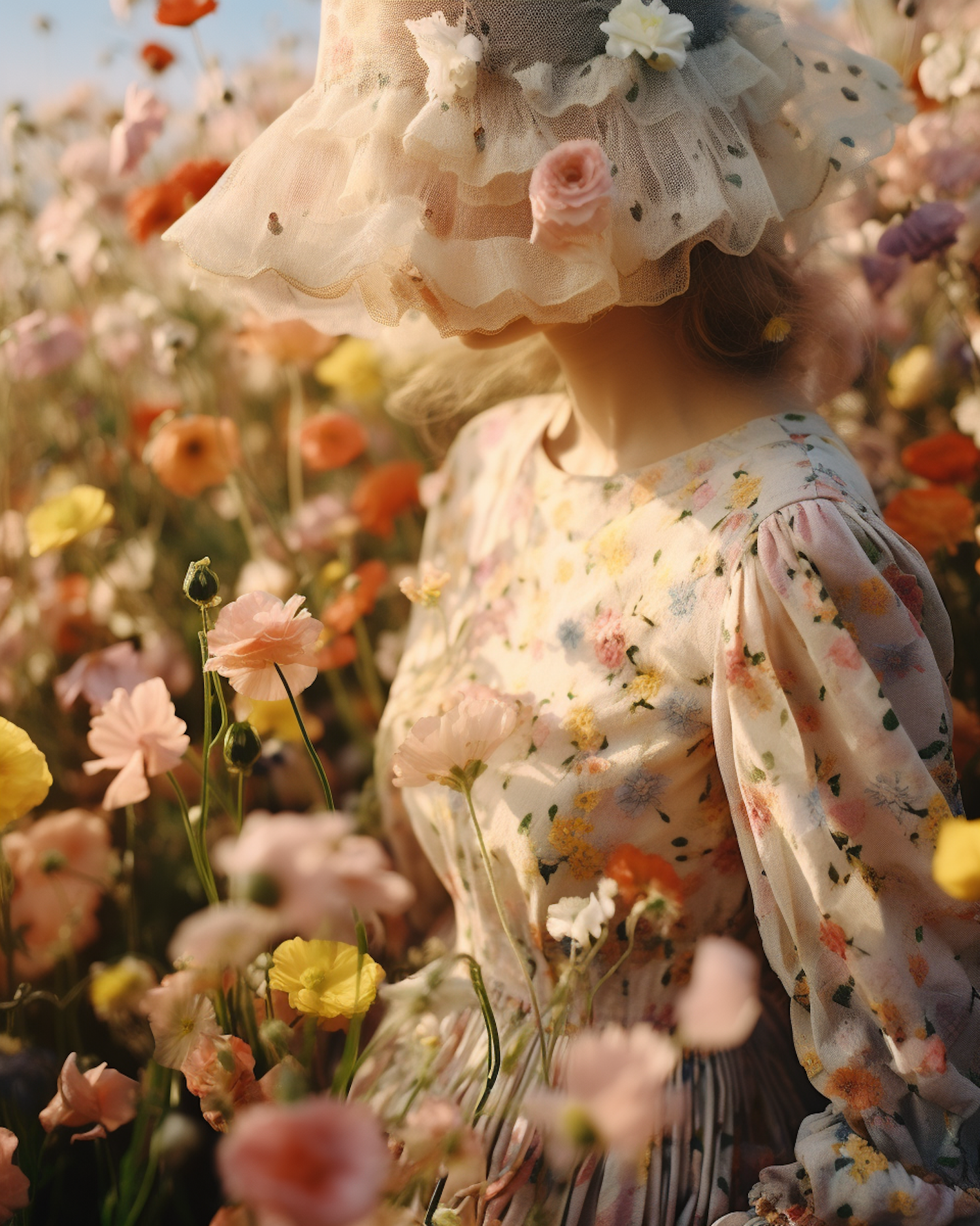 Woman in floral dress and hat adorned with flowers, standing in a vibrant field of pink, yellow, and orange blossoms under warm sunlight.