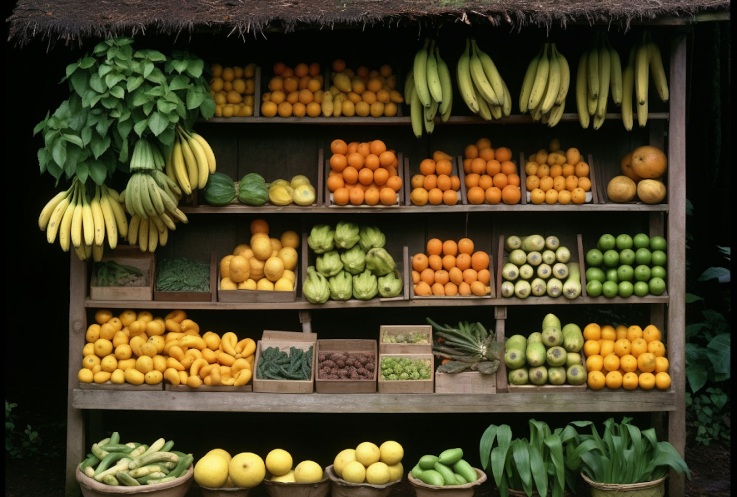 Vibrant fruit stand with bananas, oranges, lemons, and green vegetables in a rustic wooden display.