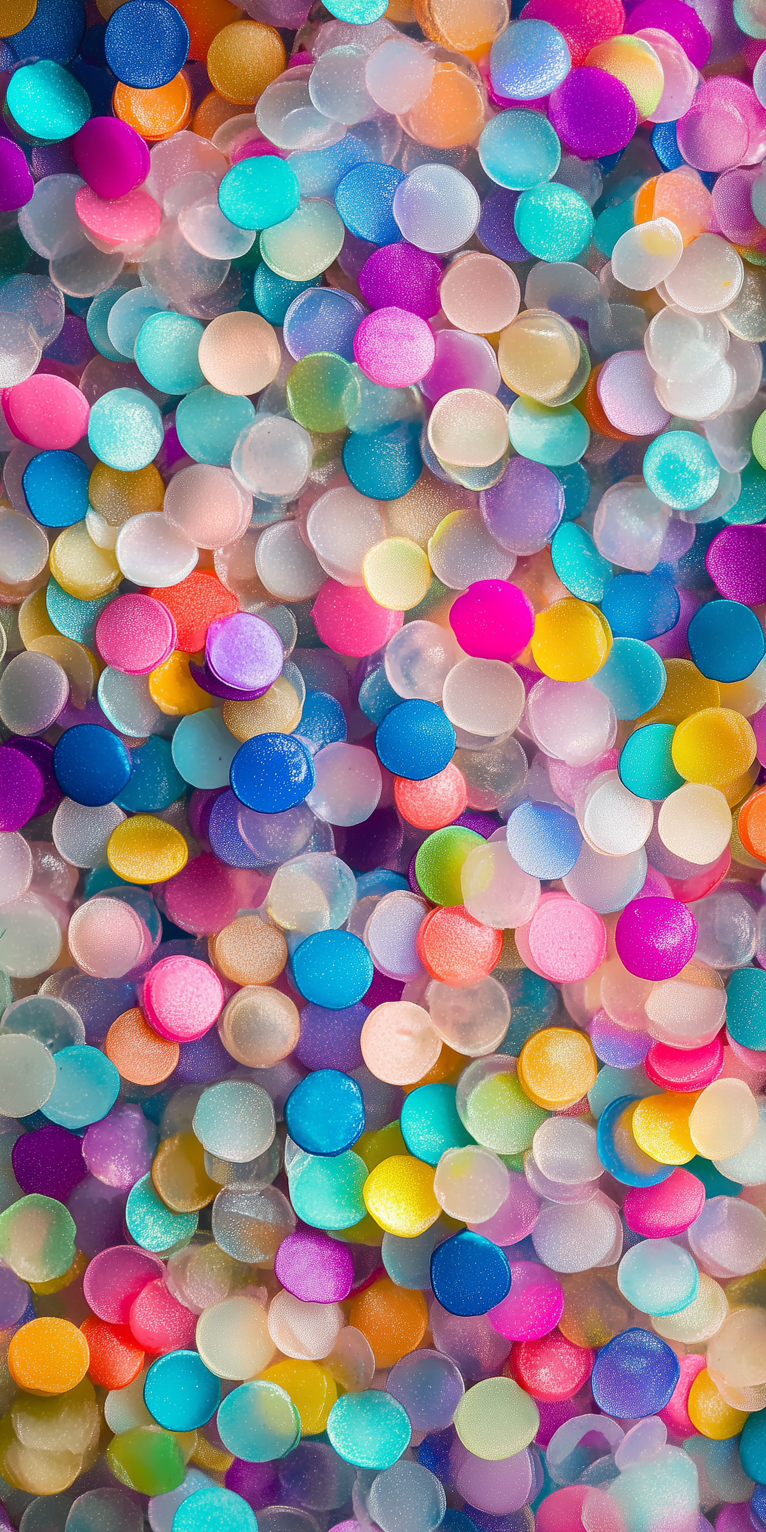 Bright and colorful close-up of translucent gel beads in pink, blue, yellow, and more, creating a playful and vibrant pattern.