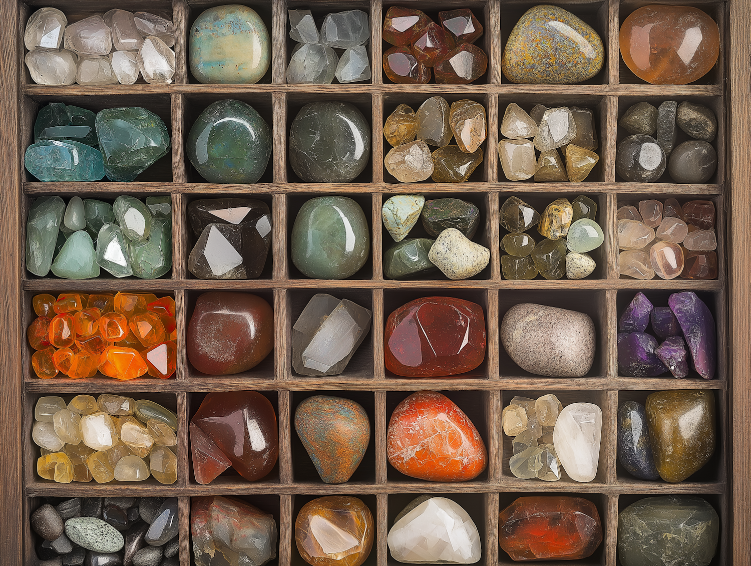 A wooden display case filled with colorful polished gemstones, showcasing a variety of hues and textures in a neatly arranged collection.