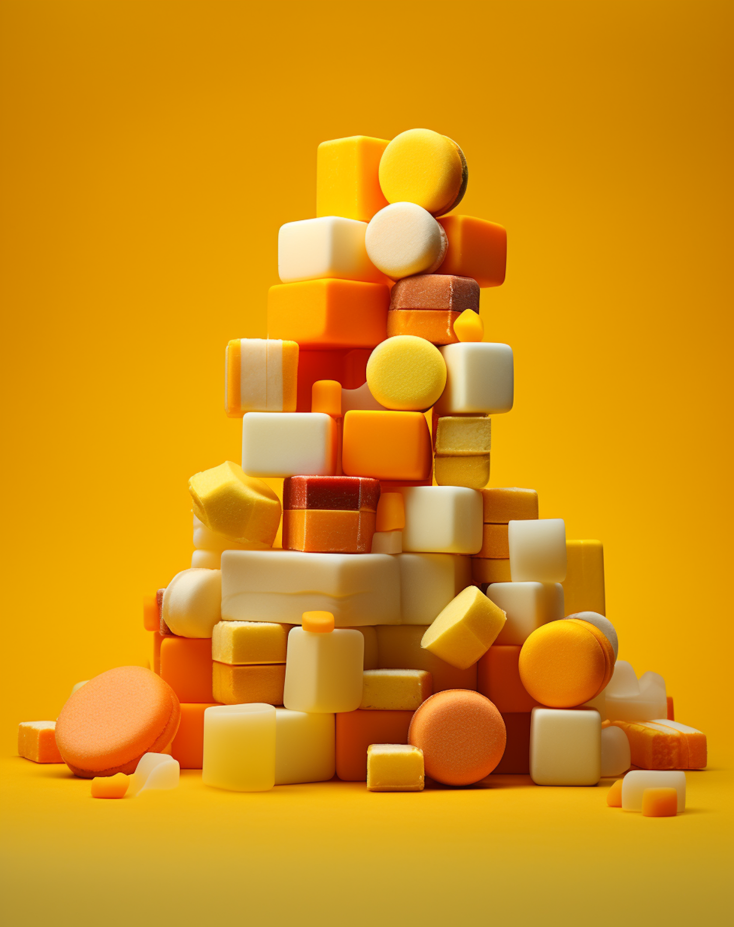 Colorful geometric shapes in yellow, orange, and white stacked in a pyramid on a bright yellow background.