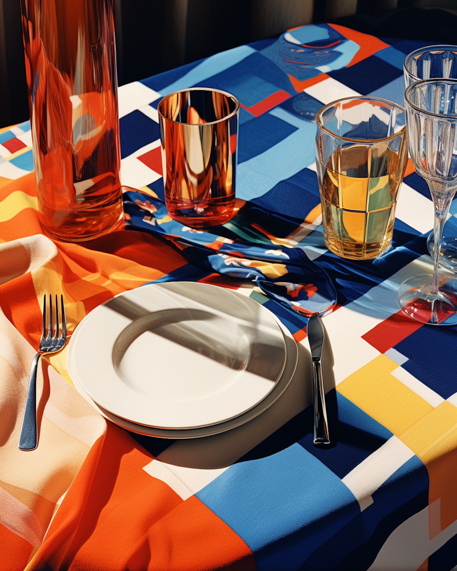 Colorful table setting with geometric tablecloth, amber glassware, and white plate. Sunlight casts dynamic shadows, creating a vibrant scene.
