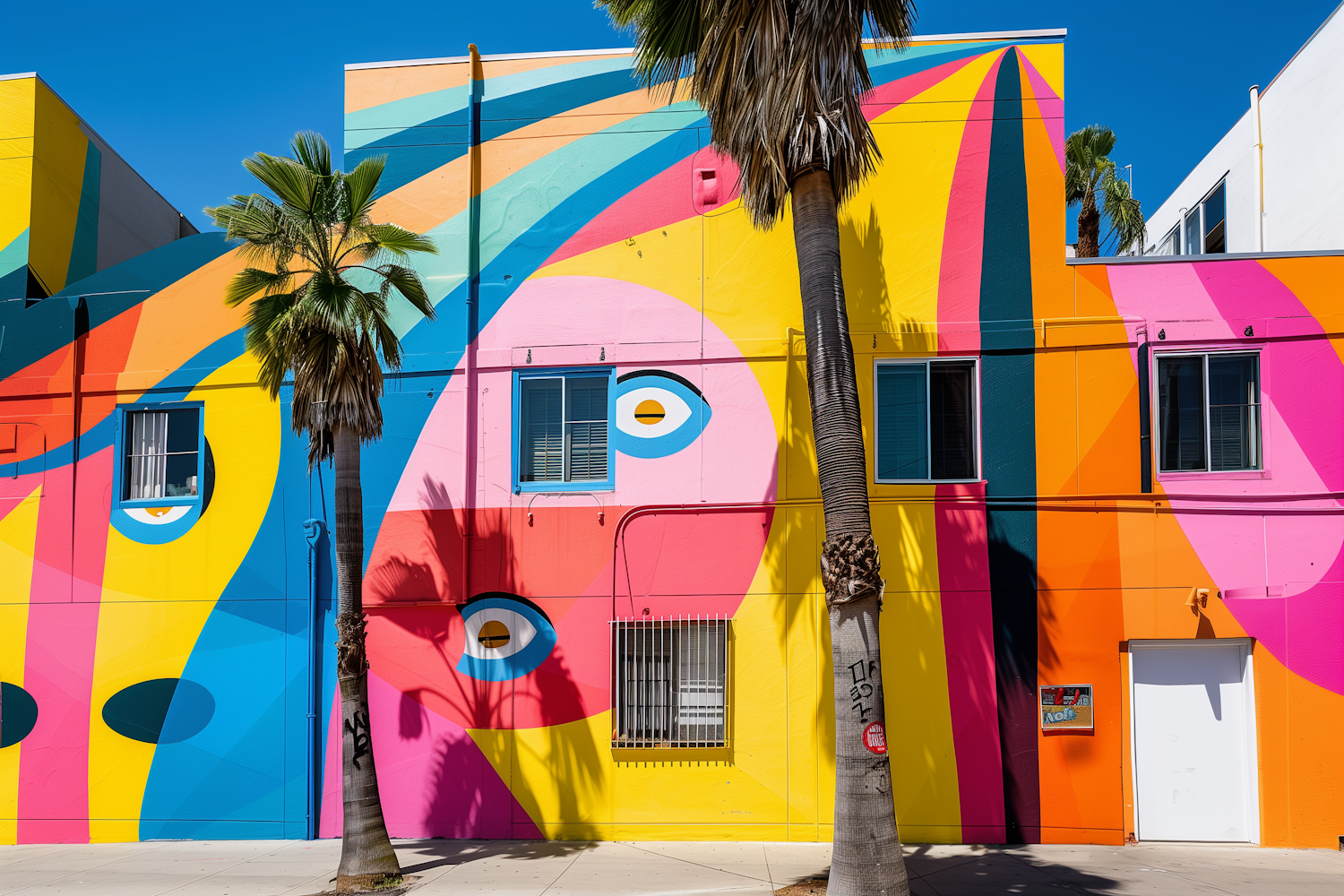 Colorful mural with abstract shapes and eyes on a building, framed by palm trees under a clear blue sky.