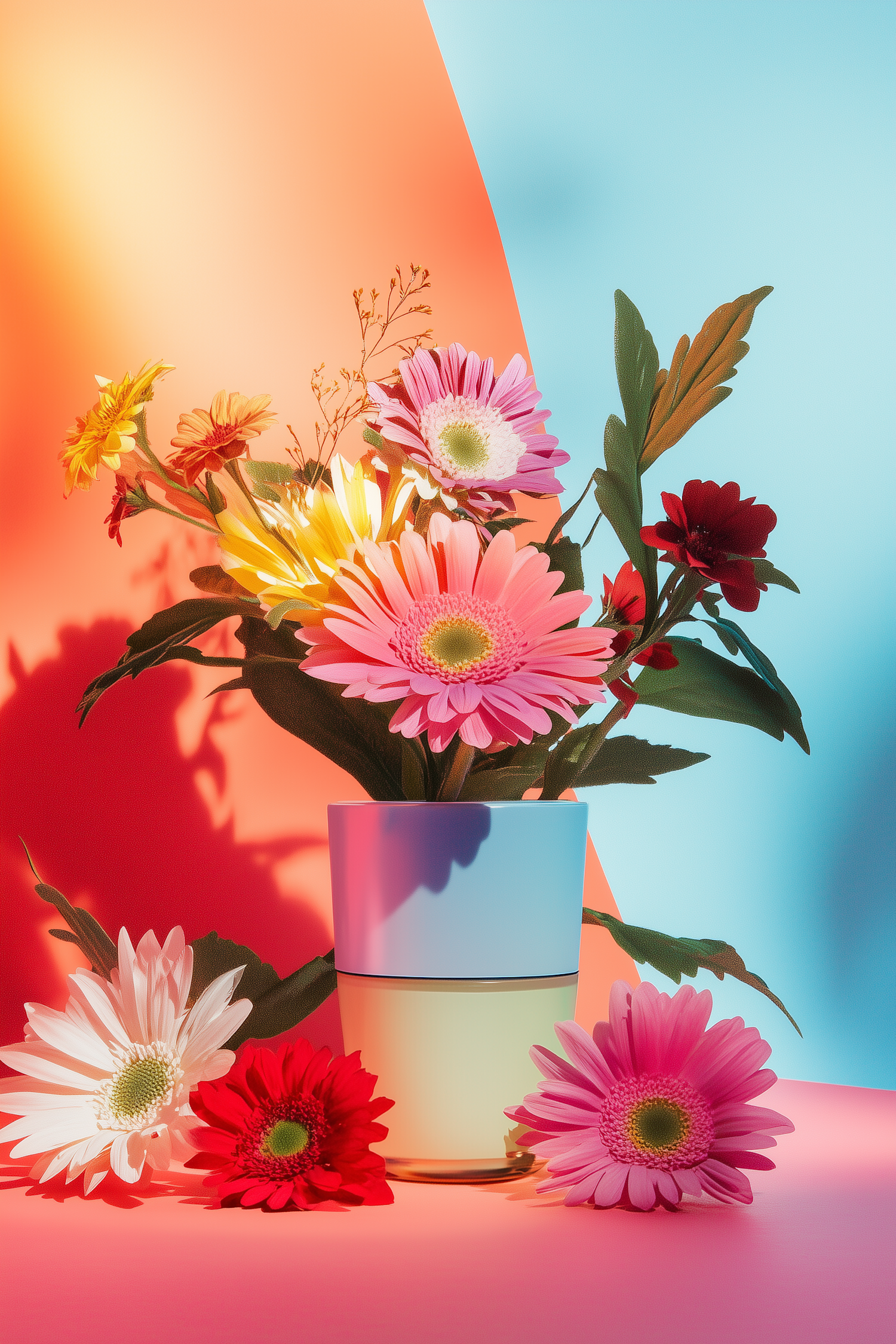 Bright gerbera daisies in a modern vase with a bold orange and blue gradient background, creating a vibrant and artistic floral display.