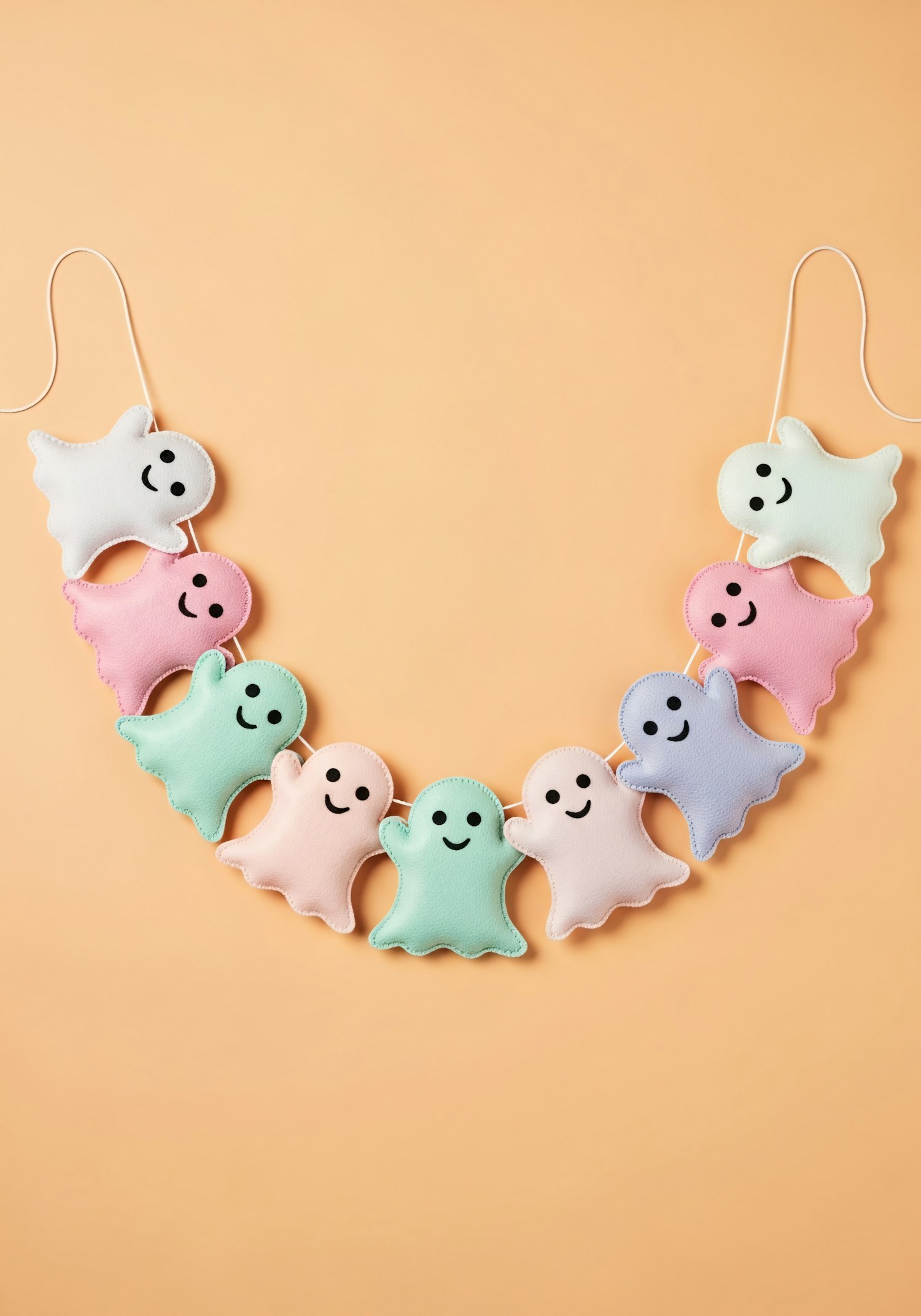 A pastel-colored ghost garland with smiling faces on a soft orange background, perfect for festive or seasonal decorations.