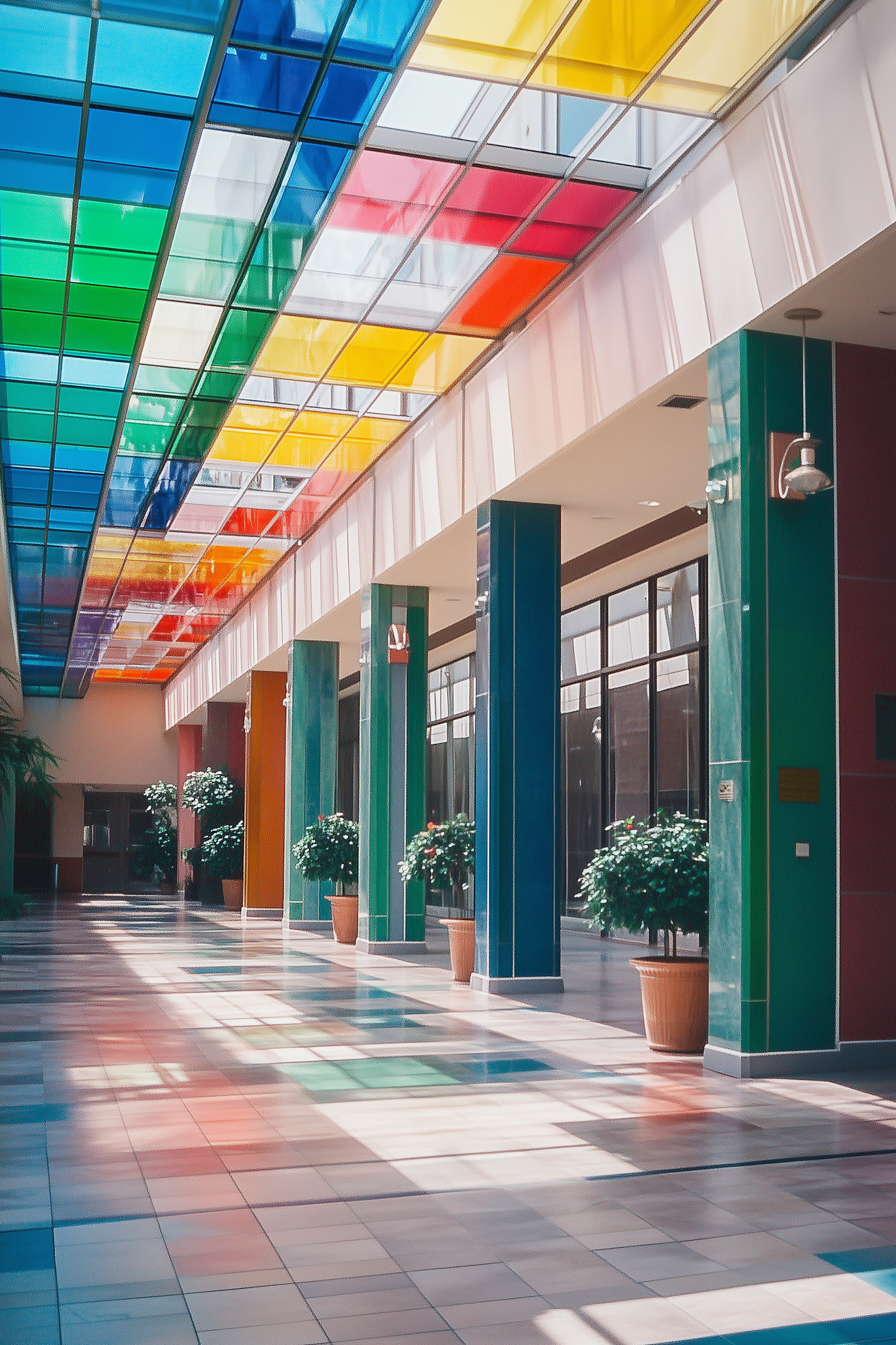 Vibrant corridor with multicolored glass ceiling, colorful reflections, and potted plants. Modern design with natural light and artistic flair.