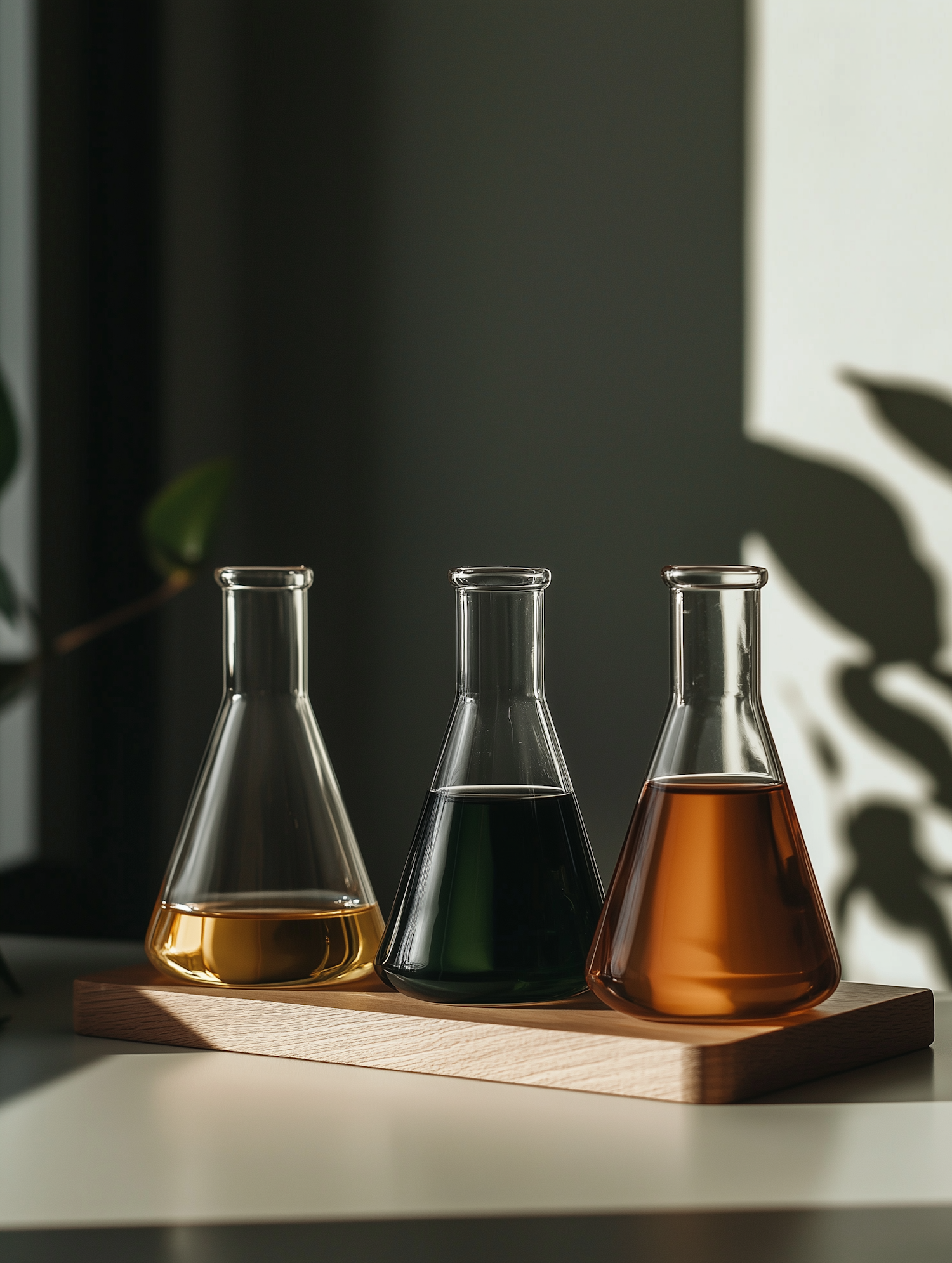 Three Erlenmeyer flasks with yellow, green, and amber liquids on a wooden tray, lit by soft natural light with shadows and a plant in the background.